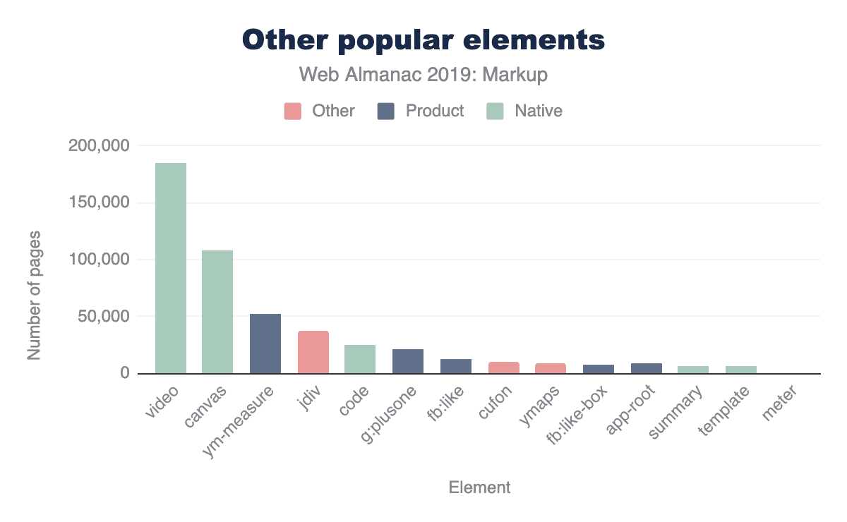 Most of the elements we recorded are custom (as in simply ’not standard’), but discussing which elements are and are not custom can get a little challenging. Written down in some spec or proposal somewhere are, actually, quite a few elements. For purposes here, we considered 244 elements as standard (though, some of them are deprecated or unsupported):
