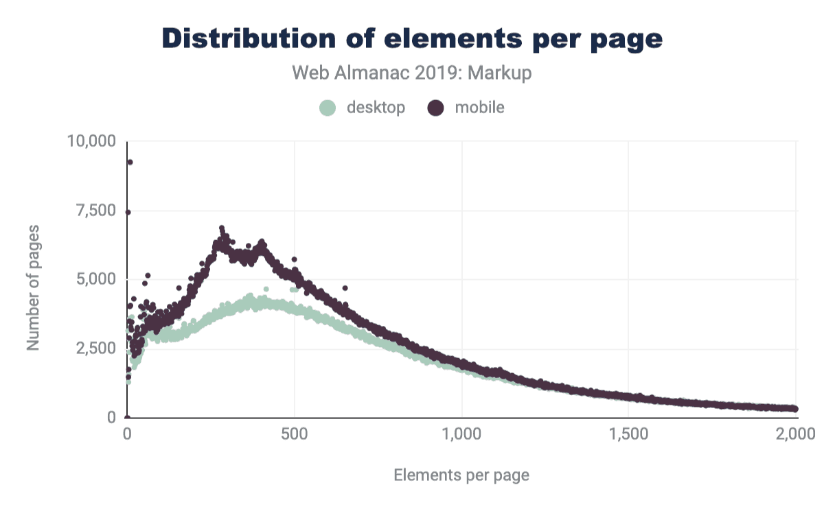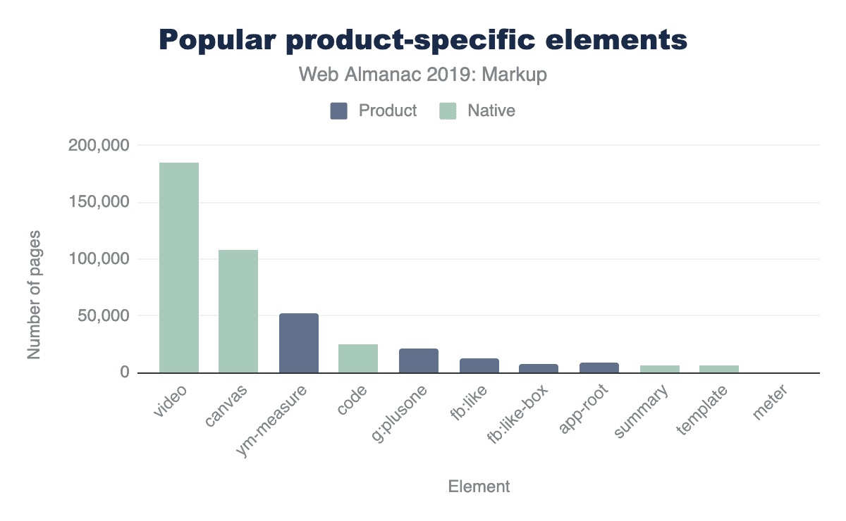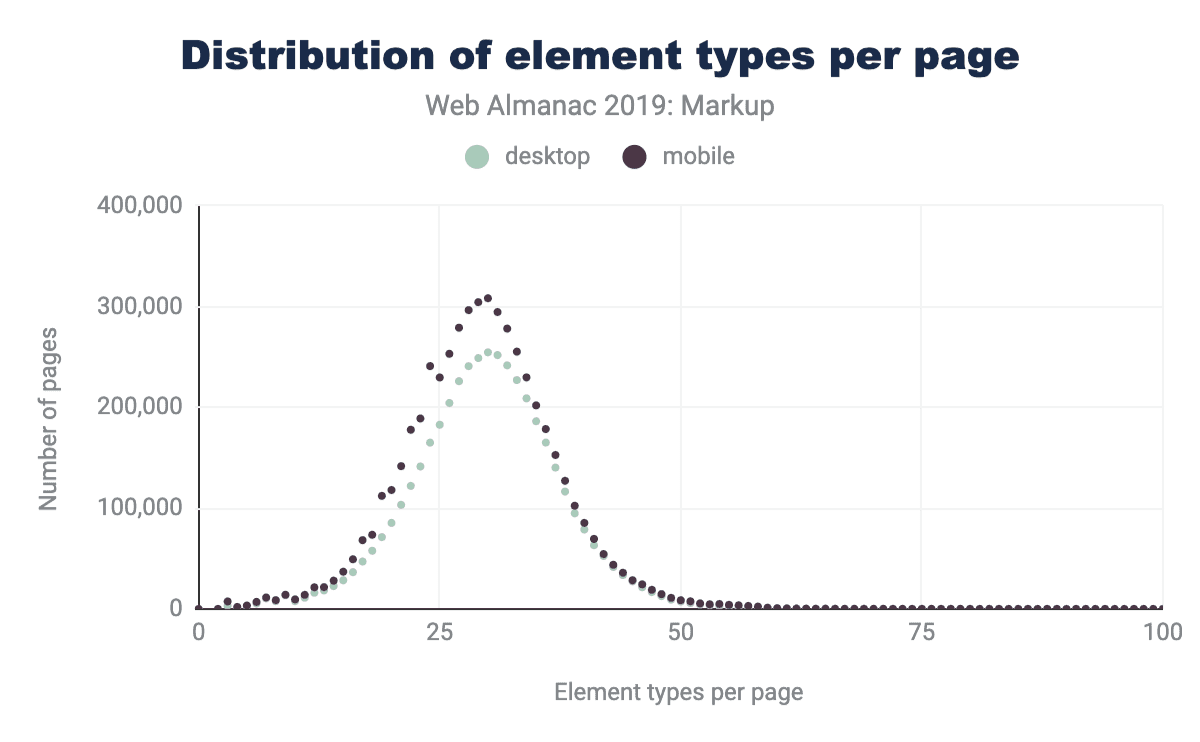 As of July 2019, the HTTP Archive has begun collecting all used element names in the DOM for about 4.4 million desktop home pages, and about 5.3 million mobile home pages which we can now begin to research and dissect. (Learn more about our Methodology.)