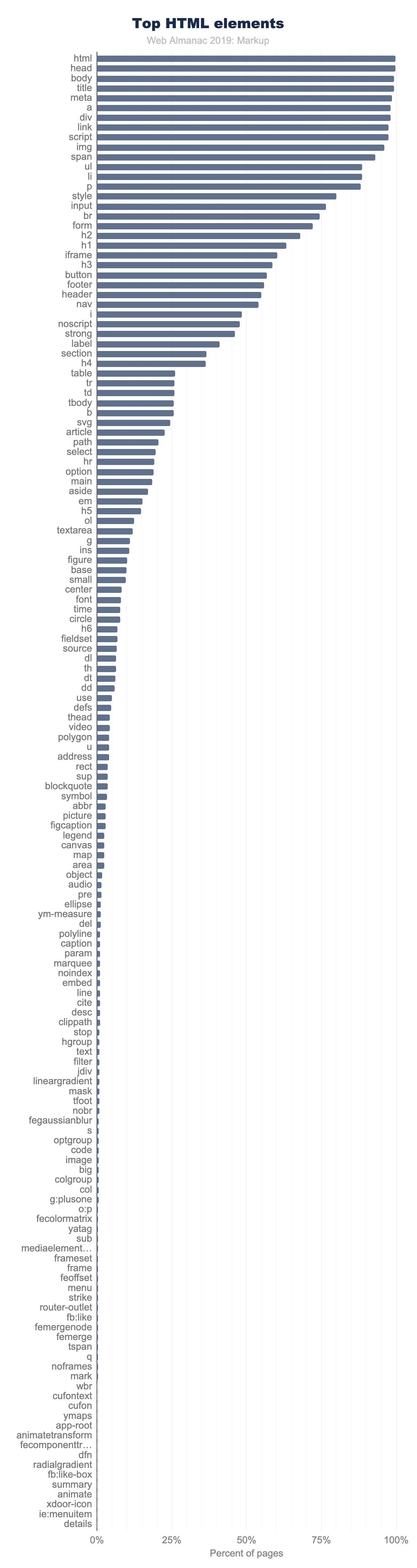 You can observe two things here. First, the set of elements that have more than 1% use are not exclusively HTML. In fact, 27 of the most popular 100 elements aren’t even HTML - they are SVG! And there are non-standard tags at or very near that cutoff too! Second, note that a whole lot of HTML elements are used by less than 1% of pages.