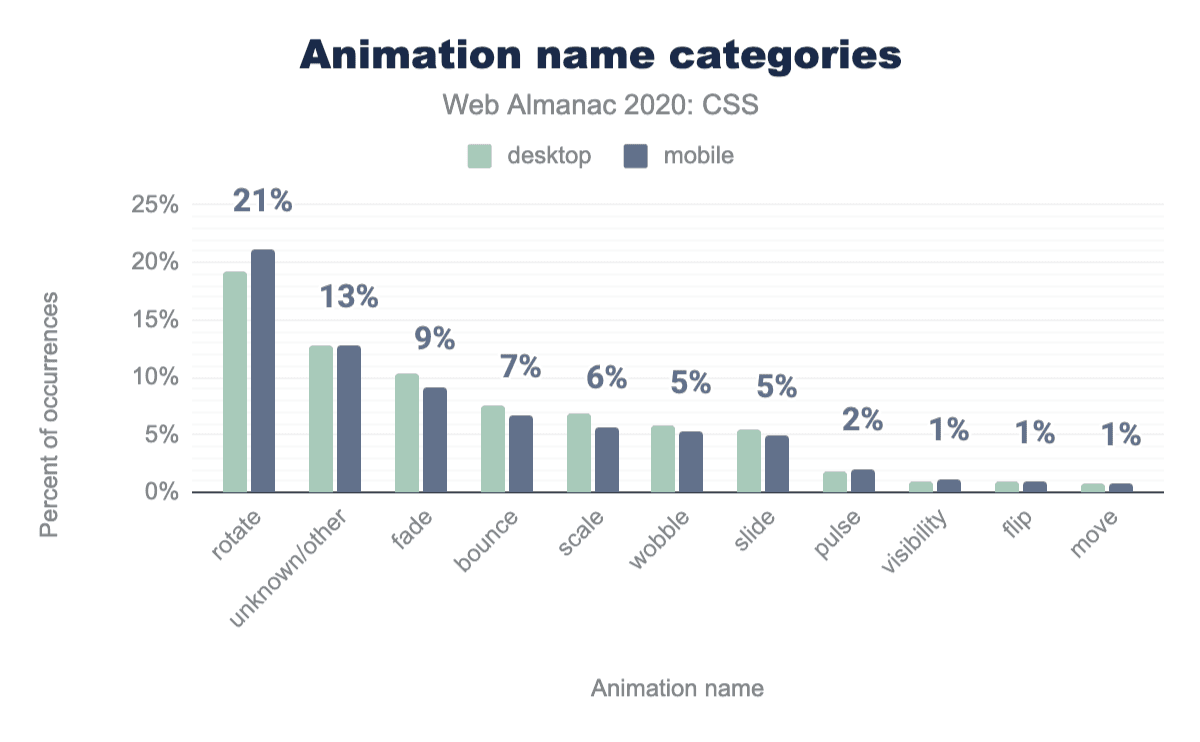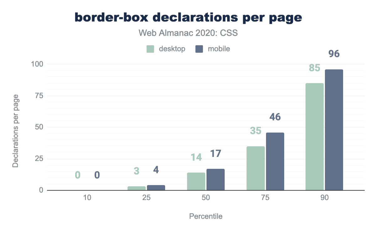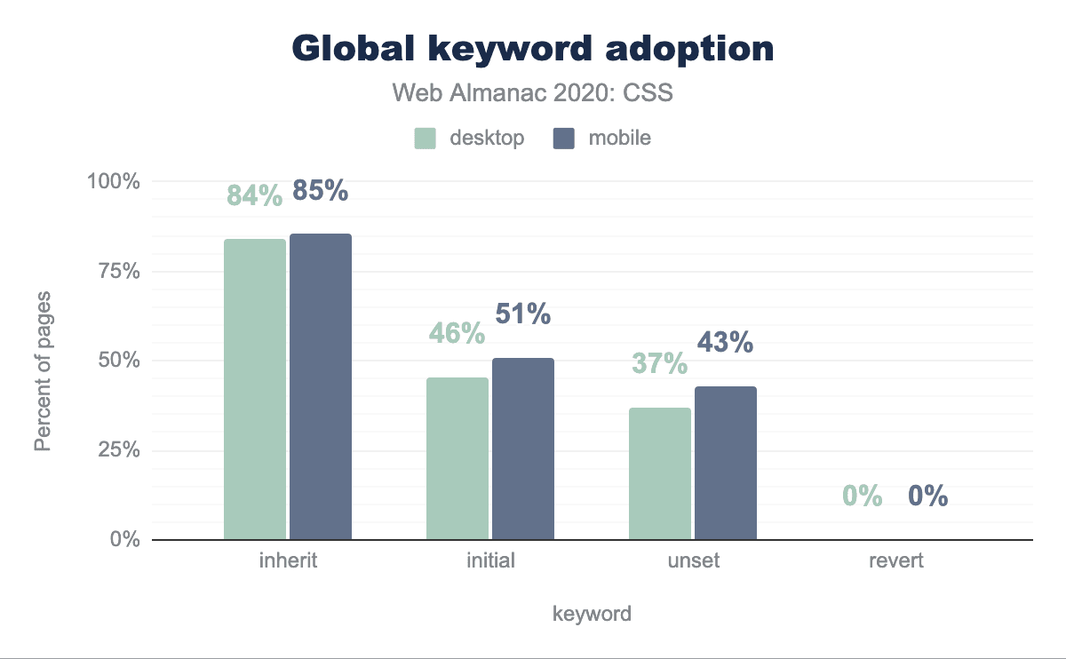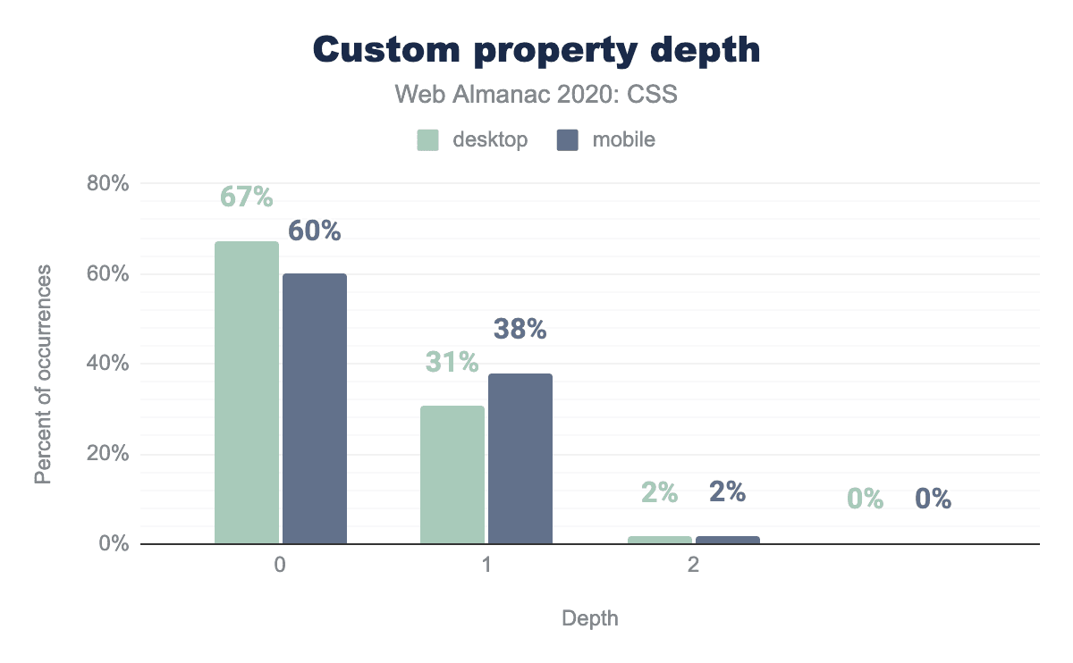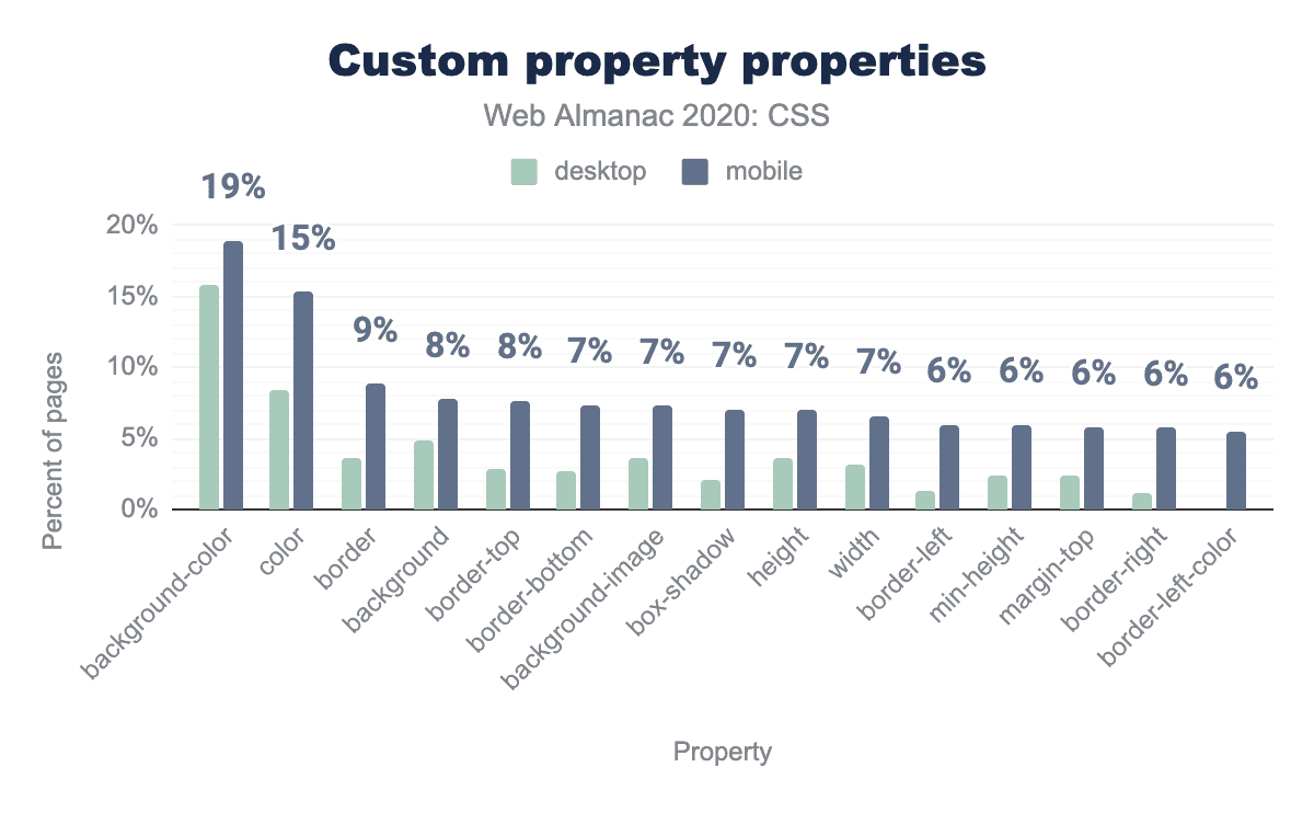 :root seems far more popular than is justified by its function, used in one third of pages. In HTML content, it just selects the <html> element, so why didn’t developers just use html? A possible answer may lie in a common practice related to defining custom properties, which are also highly used, on the :root pseudo-class. Another answer may lie in specificity: :root, being a pseudo-class, has a higher specificity than html: (0, 1, 0) vs (0, 0, 1). It is a common hack to increase specificity of a selector by prepending it with :root, e.g. :root .foo has a specificity of (0, 2, 0) compared to just (0, 1, 0) for .foo. This is often all that is needed to nudge a selector slightly over another one in the cascade race and avoid the sledgehammer that is !important. To test this hypothesis, we also measured exactly that: how many pages use :root at the start of a descendant selector? The results verified our hypothesis: a remarkable 29% of pages use :root that way! Furthermore, 14% of desktop pages and 19% of mobile pages use html at the start of a descendant selector, possibly to give the selector an even smaller specificity boost. The popularity of these specificity hacks strongly indicates that developers need more fine grained control to tweak specificity than what is afforded to them via !important. Thankfully, this is coming soon with :where(), which is already implemented across the board (albeit behind a flag in Chrome for now).