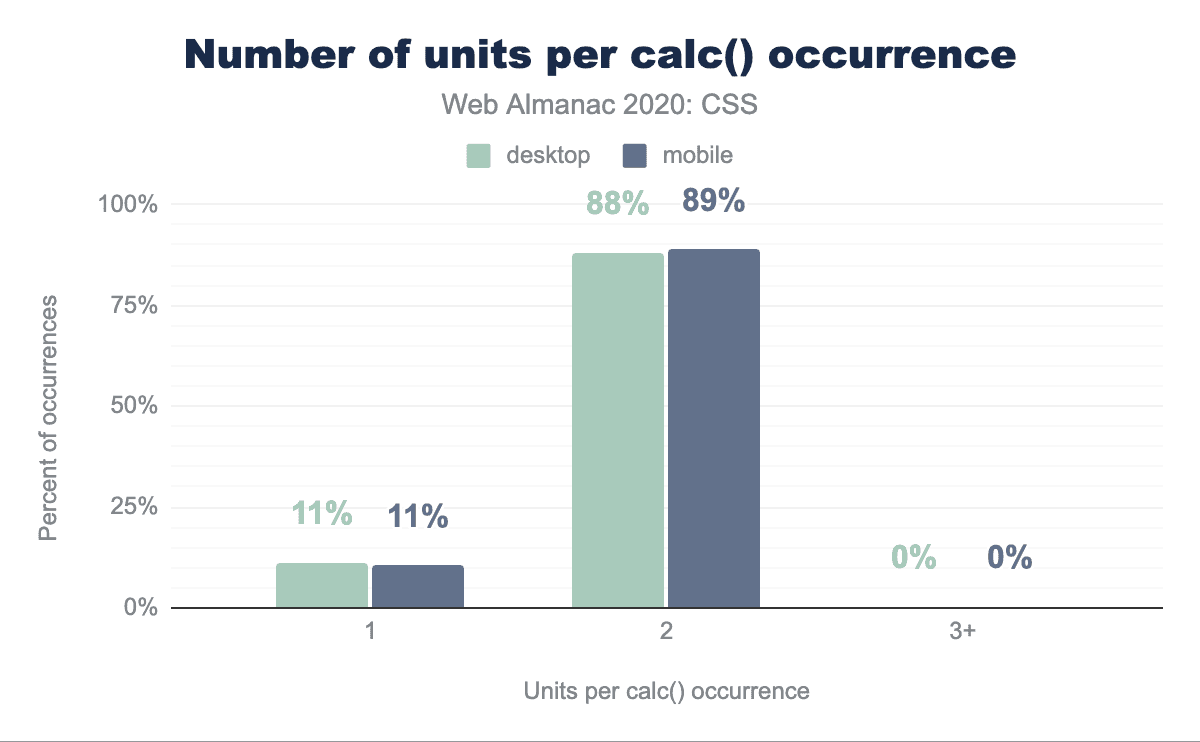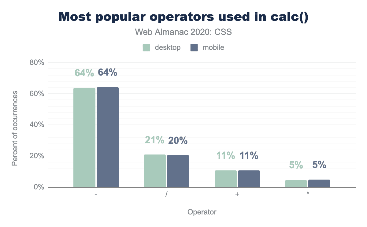 Today, calc() has been supported by every browser for nine years already, so it comes as no surprise that it has been widely adopted with 60% of pages using it at least once. If anything, we expected even higher adoption than this.