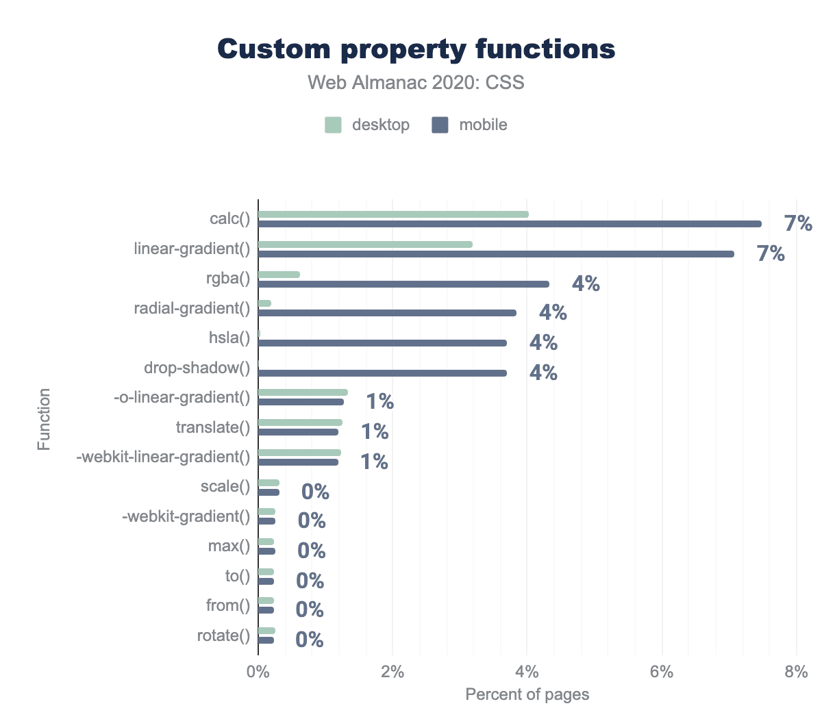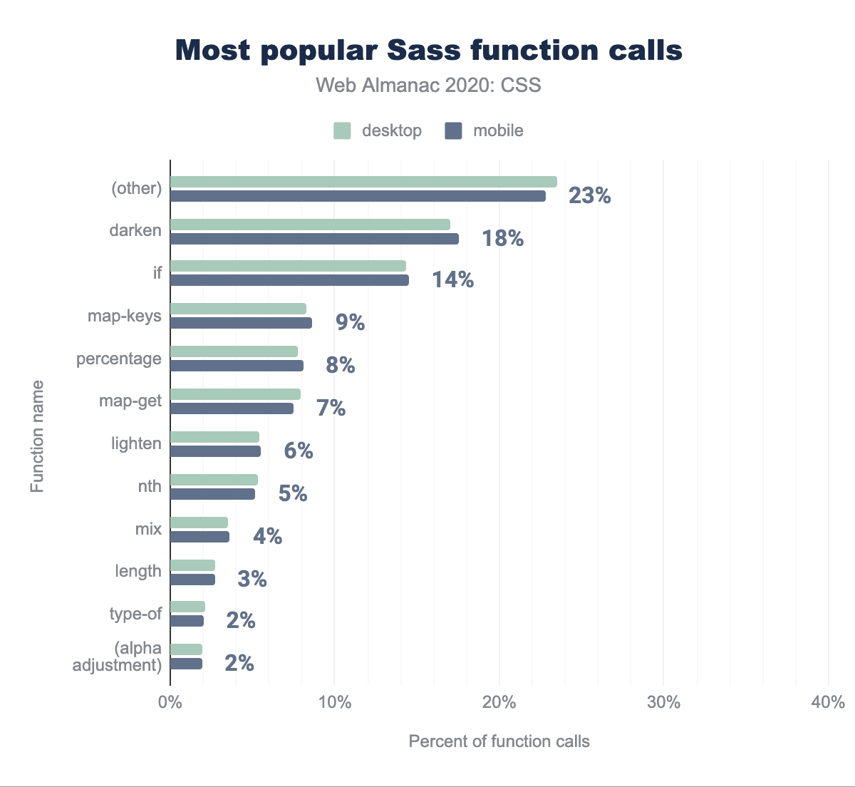(other) is used on 23% on desktop and 23% on mobile, darken is 17% and 18% respectively, if is 14% and 14%, map-keys is 8% and 9%, percentage is 8% and 8%, map-get is 8% and 7%, lighten is 5% and 6%, nth is 5% and 5%, mix is 4% and 4%, length is 3% and 3%, type-of is 2% and 2%, and (alpha adjustment) 2% on desktop and 2% on mobile.Defining custom functions is something that has been discussed for years in Houdini, but studying Sass stylesheets gives us data on how common the need is. Quite common, it turns out. At least half of SCSS stylesheets studied contain custom functions, since the median SCSS sheet contains not one, but two custom functions.