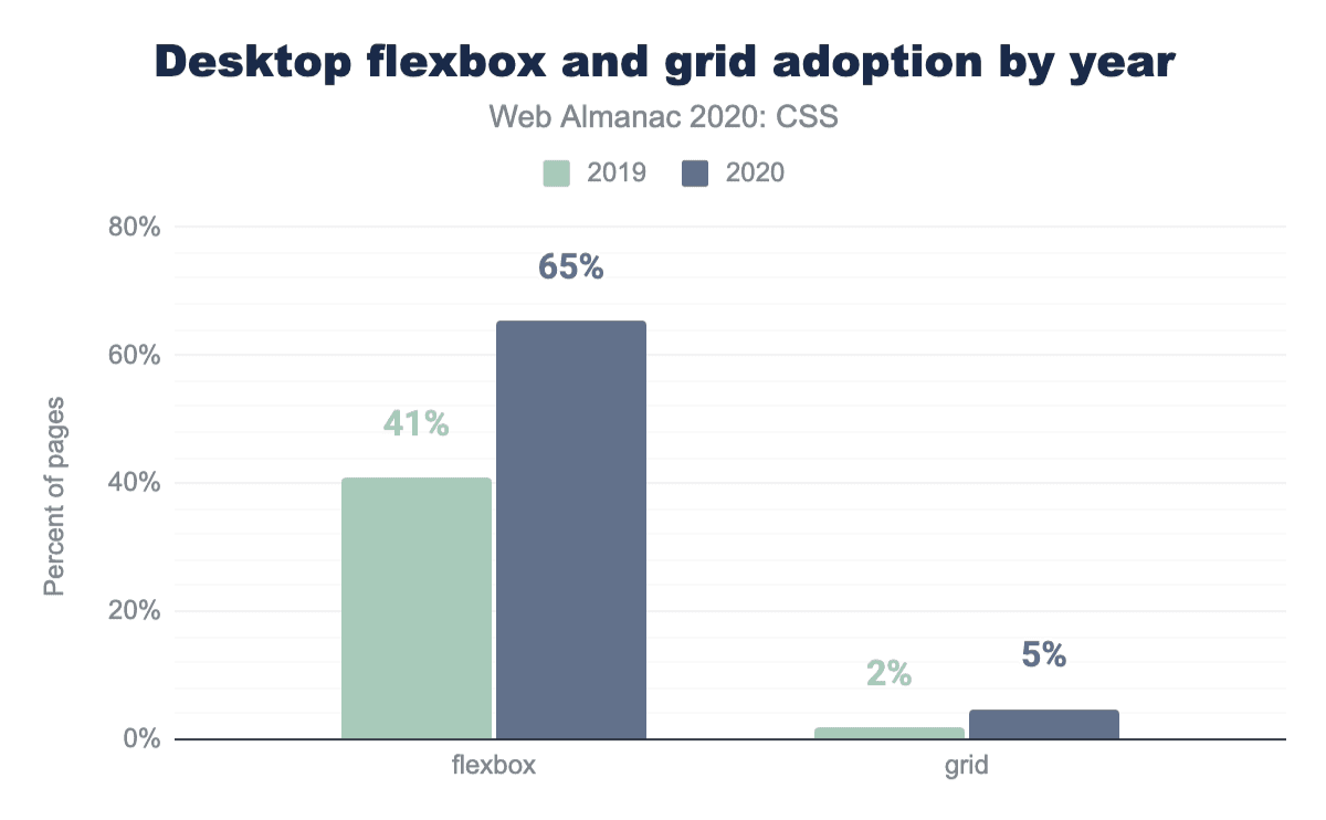Overall, what we observed was a web in two different gears when it comes to CSS adoption. In our blog posts and Twitter bubbles, we tend to mostly discuss the newest and shiniest, however, there are still millions of sites using decade-old code. Things like vendor prefixes from a bygone era, proprietary IE filters, and floats for layout, in all their clearfix glory. But we also observed impressive adoption of many new features—even features that only got support across the board this very year, like min() and max(). However, there is generally an inverse correlation between how cool something is perceived to be and how much it is actually used; for example, cutting-edge Houdini features were practically nonexistent.