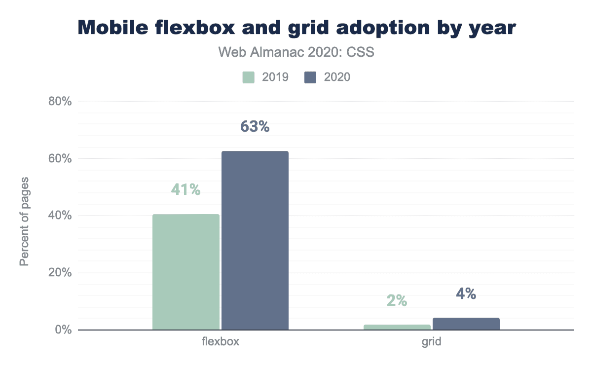 One of our takeaways was that popular libraries such as WordPress, Bootstrap, and Font Awesome are primary drivers behind adoption of new features, while individual developers tend to be more conservative.
