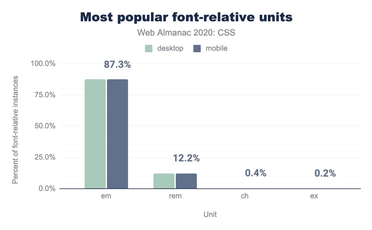 Similarly, despite the much touted advantages of rem vs em for many use cases, and its universal browser support for years, the web has still largely not caught up with it: the trusty em accounts for 87% of all font-relative units usage and rem trails far behind with 12%. We did see some usage of ch (width of the ’0’ glyph) and ex (x-height of the font in use) in the wild, but very small (only 0.37% and 0.19% of all font-relative units).