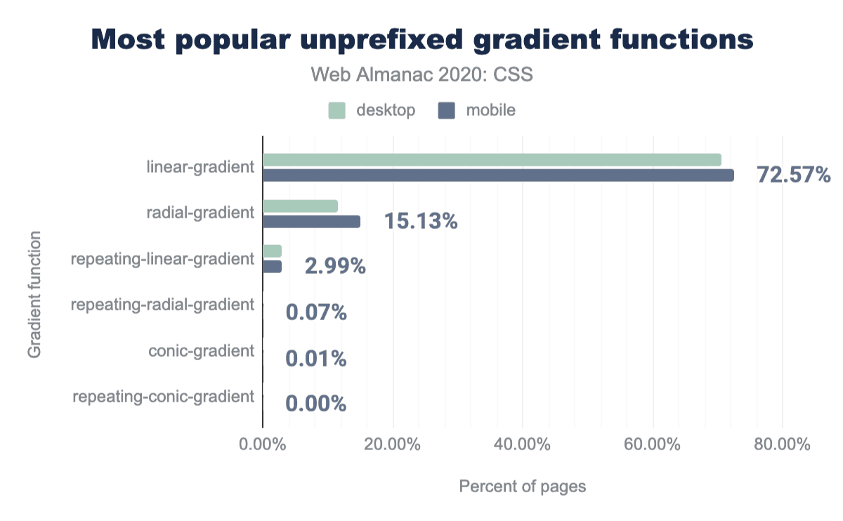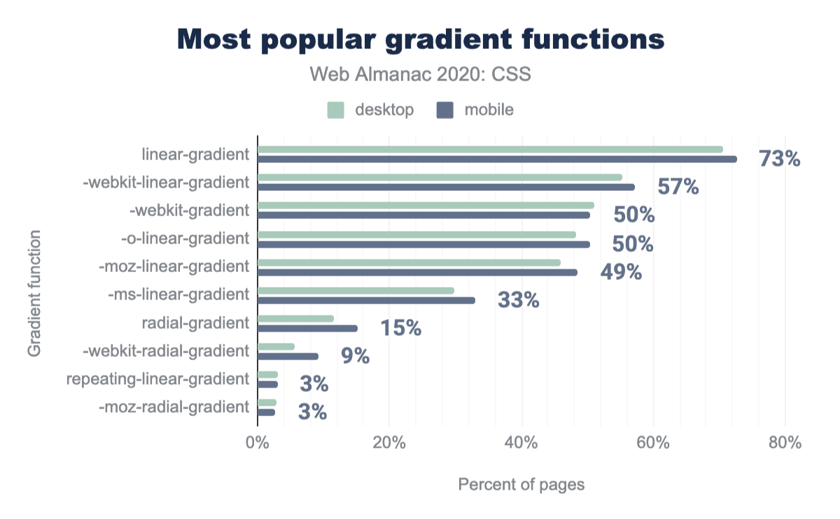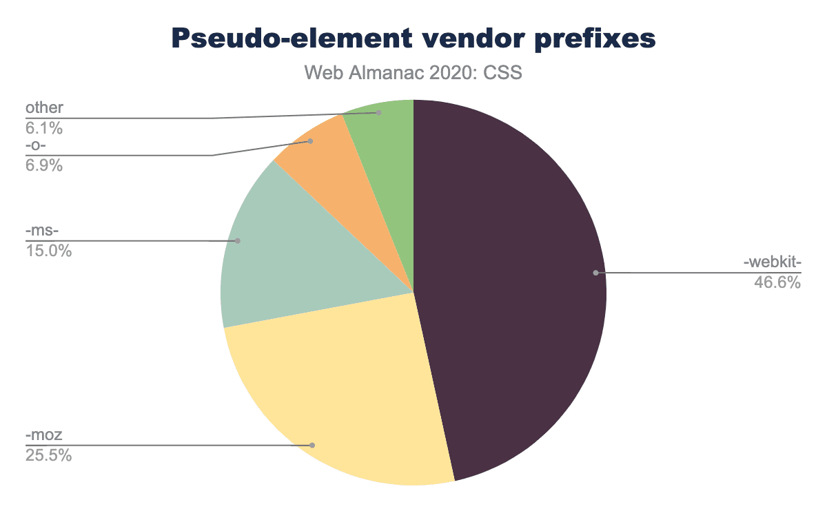 -webkit makes up 47% of pseudo-element vendor prefix usage, followed by, 26% -moz, 15% -ms, 7% -o, and 6% other.Nearly all usage of prefixed functions (98%) is to specify gradients, even though this has not been necessary since 2014. The most popular of these is -webkit-linear-gradient() used in over a quarter of pages examined. The remaining <2% is primarily for calc, for which a prefix has not been necessary since 2013.