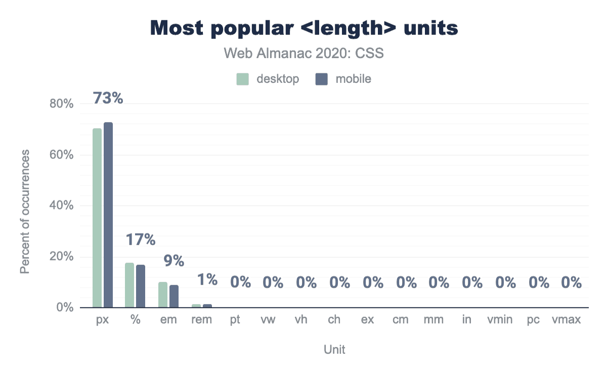 The px unit is still going strong as the most popular length unit overall, with a whopping 72.58% of all length values across all style sheets using px! And if we exclude percentages (since they are not really a unit) the share of px increases even more, to 84.14%.