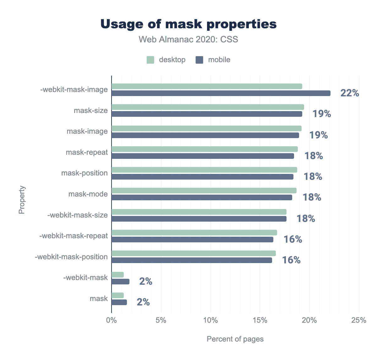 Prefixed properties take up the lion’s share of that, since 84% of all prefixed features used were properties and these were used on 90.76% of mobile pages, and 89.66% of desktop pages. This is most likely a remnant of the prefix-happy CSS3 era circa 2009-2014. This is also evident from the most popular prefixed ones, none of which have actually needed prefixes since 2014: