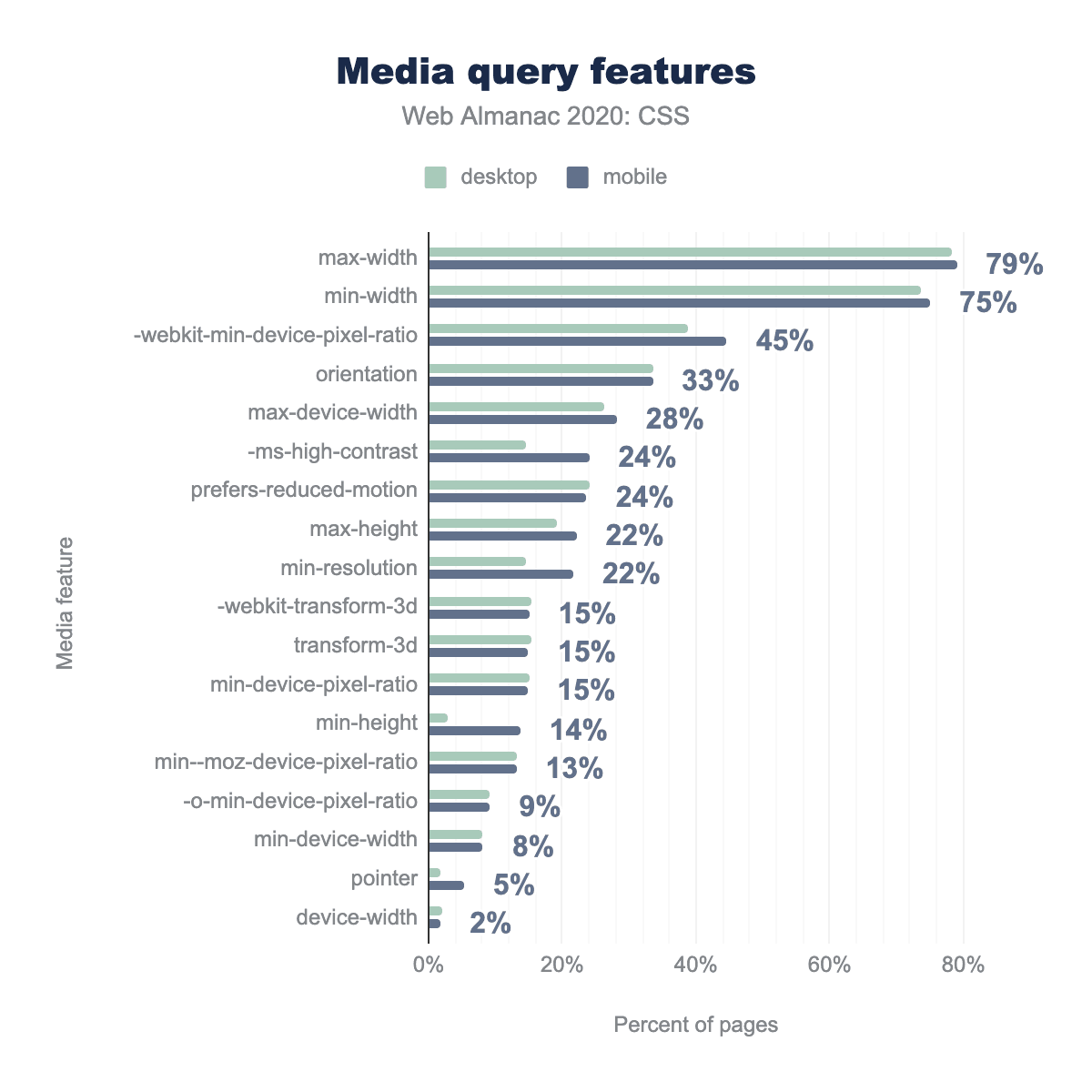 Usage of prefixed media features is lower overall, with the most popular one, -webkit-min-pixel-ratio used in 13% of pages to detect “Retina” displays. The corresponding standard media feature, resolution has finally surpassed it in popularity and is used in 22% of mobile pages and 15% desktop pages.