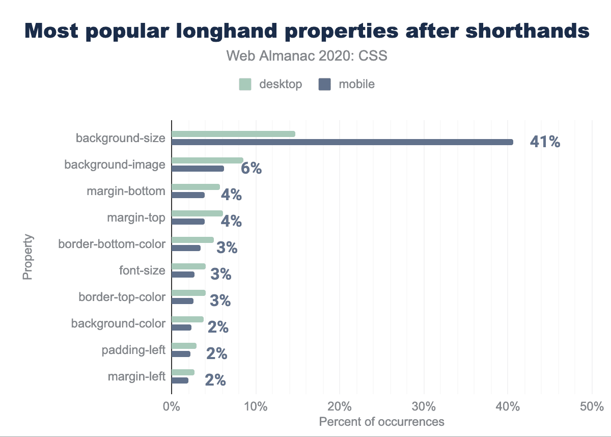 So how frequently does this occur? Very, as it turns out. 88% of pages use this strategy at least once. By far, the most frequent longhand this happens with is background-size, accounting for 40% of all longhands that come after their shorthand, indicating that the slash syntax for background-size in background may not have been the most readable or memorable syntax we could have come up with. No other longhand comes close to this frequency. The remaining 60% is a long tail spread across many other properties evenly.