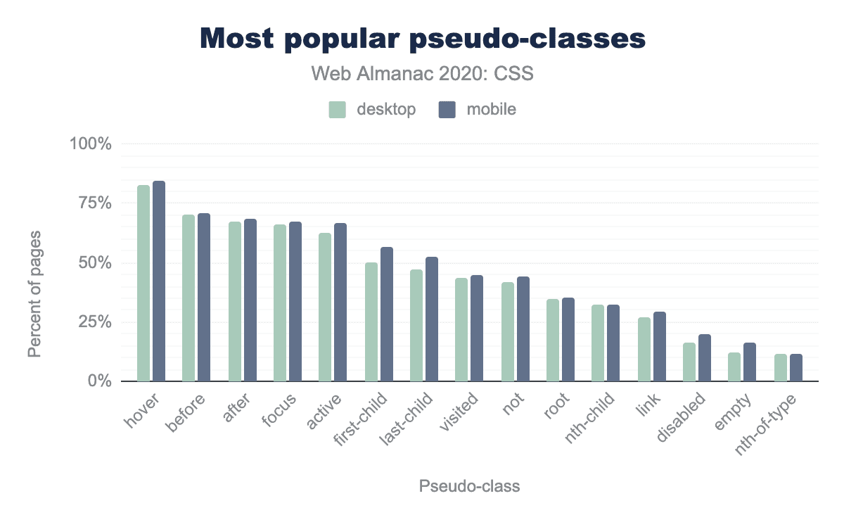 hover, used on 84% of pages. The following pseudo-classes decrease in popularity from 71% to 12% almost linearly: before, after, focus, active, first-child, last-child, visited, not, root, nth-child, link, disabled, empty, nth-of-type.When it comes to pseudo-elements, after the usual suspects ::before and ::after, nearly all popular pseudo-elements were browser extensions for styling form controls and other built-in UI, strongly echoing the developer need for more fine-grained control over styling of built in UI. Styling of focus rings, placeholders, search inputs, spinners, selection, scrollbars, media controls was especially popular.