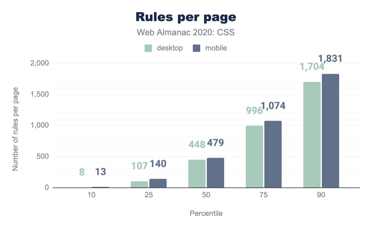 Another metric of size is the number of rules. The median page carries a total of 448 rules and 5,454 declarations. Interestingly, 10% of pages contain a tiny amount of CSS: fewer than 13 rules! Despite mobile having slightly smaller stylesheets, it also has slightly more rules, indicating smaller rules overall (as it tends to happen with media queries).