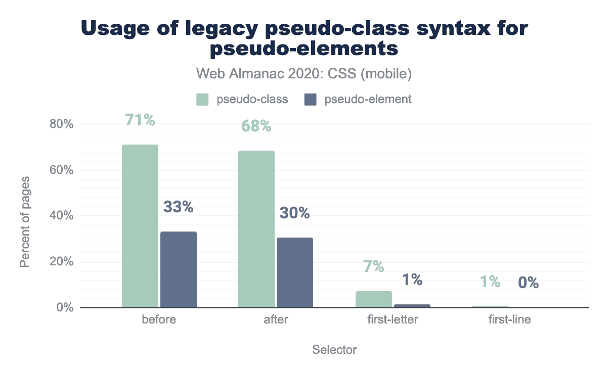 before pseudo-element is used with pseudo-class syntax on 71% of mobile pages and pseudo-element syntax on 33% of mobile pages. The after pseudo-element is used with class and element syntax on 68% and 30% of mobile pages, first-letter on 7% and 1% of mobile pages, and first-line on 1% and 0% of mobile pages.:pseudo-class syntax for ::pseudo-elements as a percent of mobile pages.