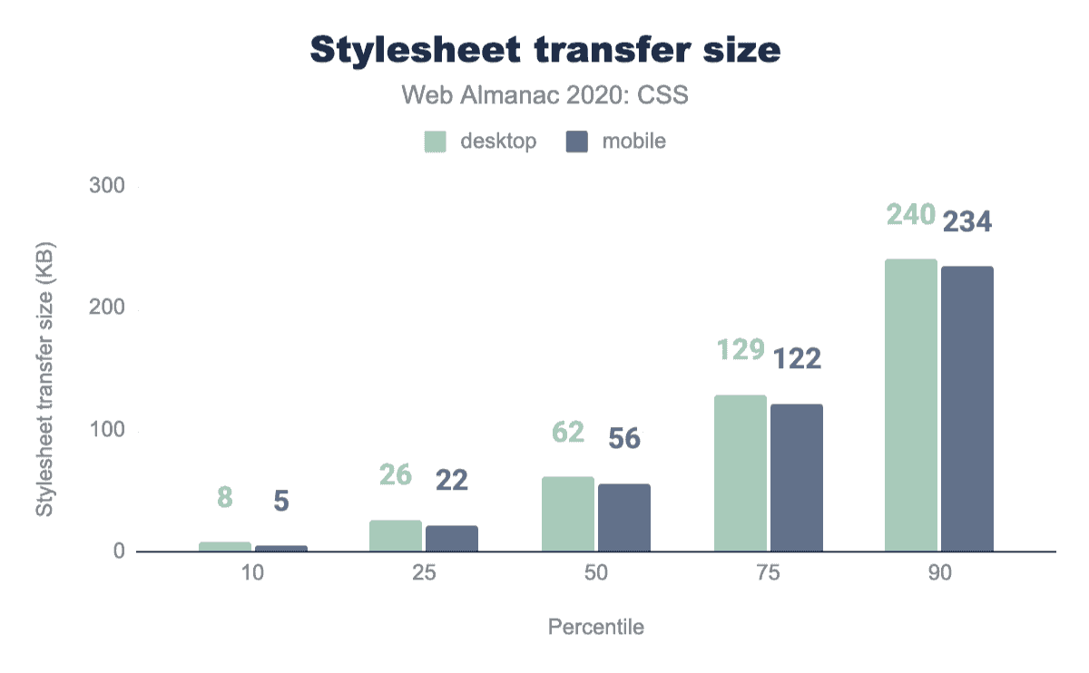While JavaScript far surpasses CSS in its share of page weight, CSS has certainly grown in size over the years, with the median desktop page loading 62 KB of CSS code, and one in ten pages loading more than 240 KB of CSS code. Mobile pages do use slightly less CSS code across all percentiles, but only by 4 to 7 KB. While this is definitely greater than previous years, it doesn’t come close to JavaScript’s whopping median of 444 KB and top 10% of 1.2 MB