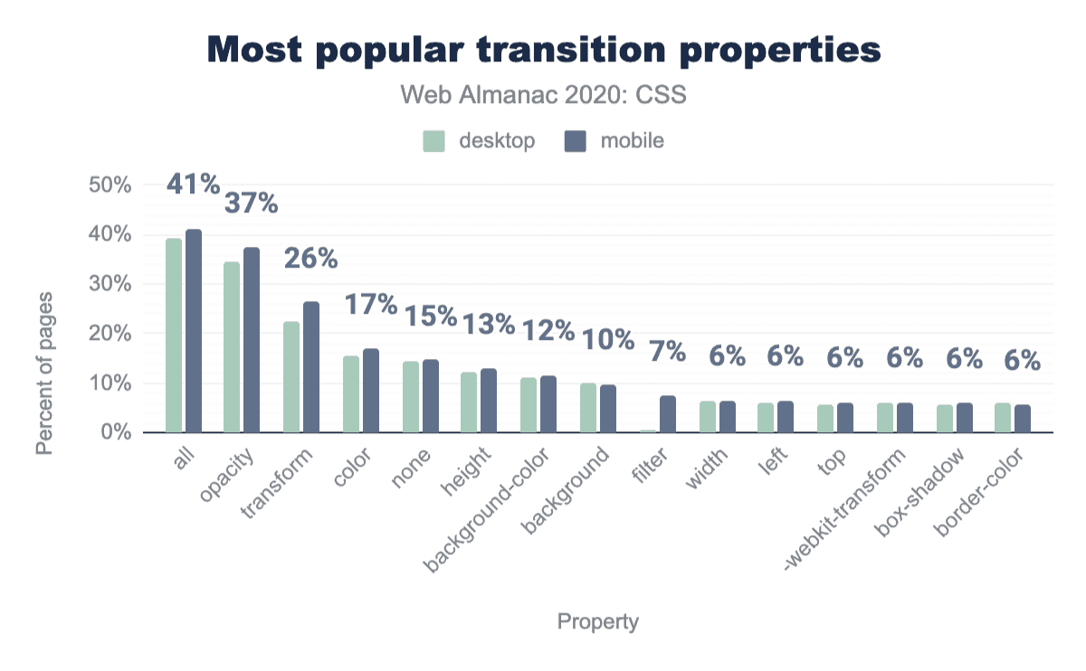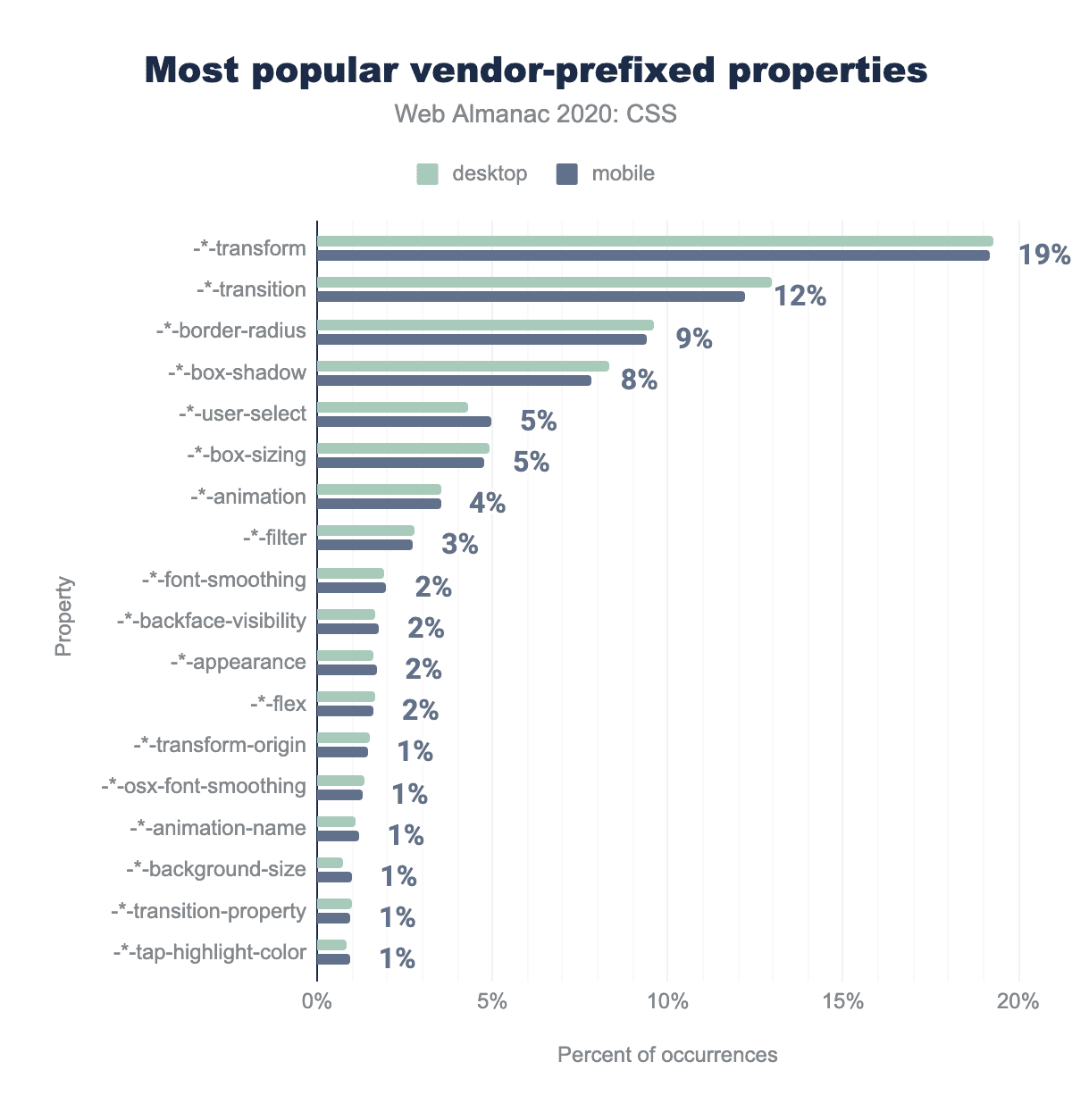 transform property makes up 19% of vendor prefix usage, followed by 12% transition, 9% border-radius, 8% box-shadow, 5% user-select and box-sizing, 4% animation, 3% filter, 2% each of font-smoothing, backface-visibility, appearance, and flex, and 1% usage for the remaining properties: transform-origin, osx-font-smoothing, animation-name, background-size, transition-property, and tap-highlight-color.Some of these prefixes, like -moz-border-radius, haven’t been useful since 2011. Even more mind-boggling, other prefixed properties that never existed, are still moderately common, with roughly 9% of all pages including -o-border-radius!