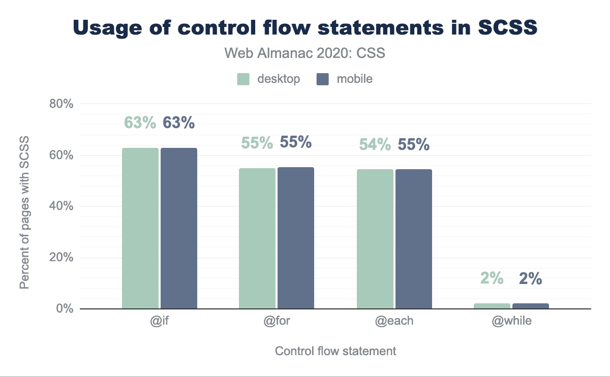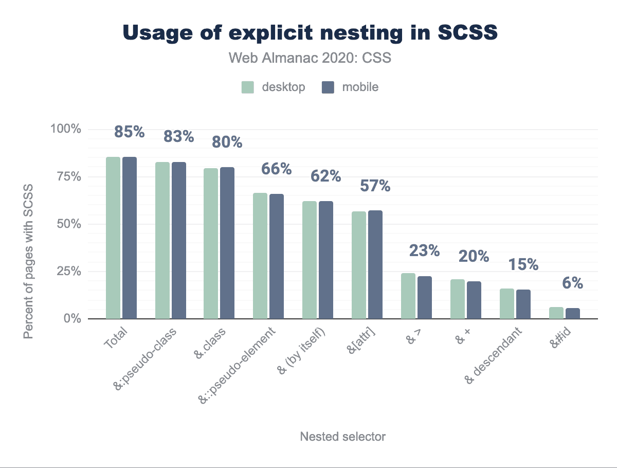 @if is used on 63% of desktop and 63% of mobile, @for is 55% and 55% respectively, @each is 54% and 55%, and @while is 2% and 2%.Another future spec that is currently worked on is CSS Nesting, which will afford us the ability to nest rules within other rules similarly to what we can do in Sass and other preprocessors by using &. How commonly is nesting used in SCSS sheets? Very, it turns out. The vast majority of SCSS sheets use at least one explicitly nested selector, with pseudo-classes (e.g. &:hover) and classes (e.g. &.active) making up three quarters of it. And this does not account for implicit nesting, where a descendant is assumed, and the & character is not required.