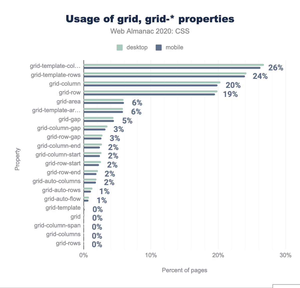 grid-template-columns is 27% on desktop and 26% on mobile, grid-template-rows is 24% and 24% respectively, grid-column is 20% and 20%, grid-row is 20% and 19%, grid-area is 6% and 6%, grid-template-areas is 6% and 6%, grid-gap is 4% and 5%, grid-column-gap is 4% and 3%, grid-row-gap is 3% and 3%, grid-column-end is 3% and 2%, grid-column-start is 3% and 2%, grid-row-start is 3% and 2%, grid-row-end is 2% and 2%, grid-auto-columns is 2% and 2%, grid-auto-rows is 1% and 1%, grid-auto-flow is 1% and 1%, grid-template is 0% and 0%, grid is 0% and 0%, grid-column-span is 0% and 0%, grid-columns is 0% and 0%, and grid-rows is 0% and 0%.CSS mistakes