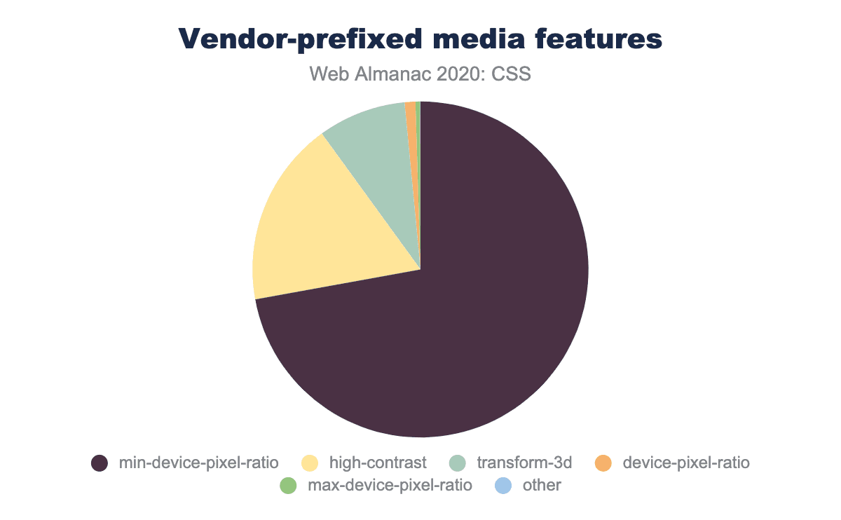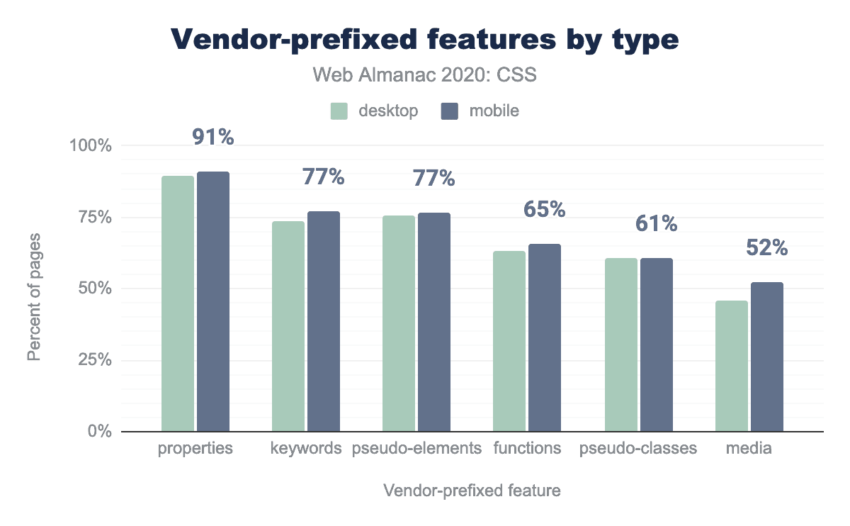Even though prefixing is now recognized as a failed way to introduce experimental features to developers, and browsers have largely stopped using it, opting for flags instead, a whopping 91% of pages still use at least one prefixed feature.