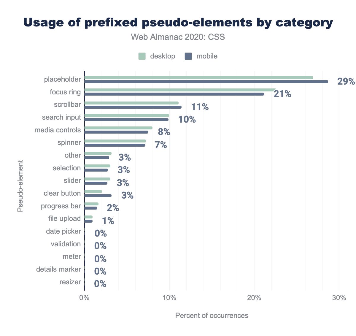 :ms-input-placeholder is used on 10% of mobile pages, :-moz-placeholder 8%, :-mox-focusring 2%, and 1% or less for the following: :-webkit-full-screen, :-moz-full-screen, :-moz-any-link, :-webkit-autofill, :-o-prefocus, :-ms-fullscreen, :-ms-input-placeholder [sic], :-ms-lang, :-moz-ui-invalid, :-webkit-input-placeholder, :-moz-input-placeholder, and :-webkit-any-link.The most common prefixed pseudo-element is ::-moz-focus-inner, used to disable Firefox’s inner focus ring. It makes up almost a quarter of prefixed pseudo-elements and for which there is no standard alternative. Another quarter of prefixed pseudo-elements is yet again for styling placeholders, while the standard version, ::placeholder, trails far behind, used in only 4% of pages.