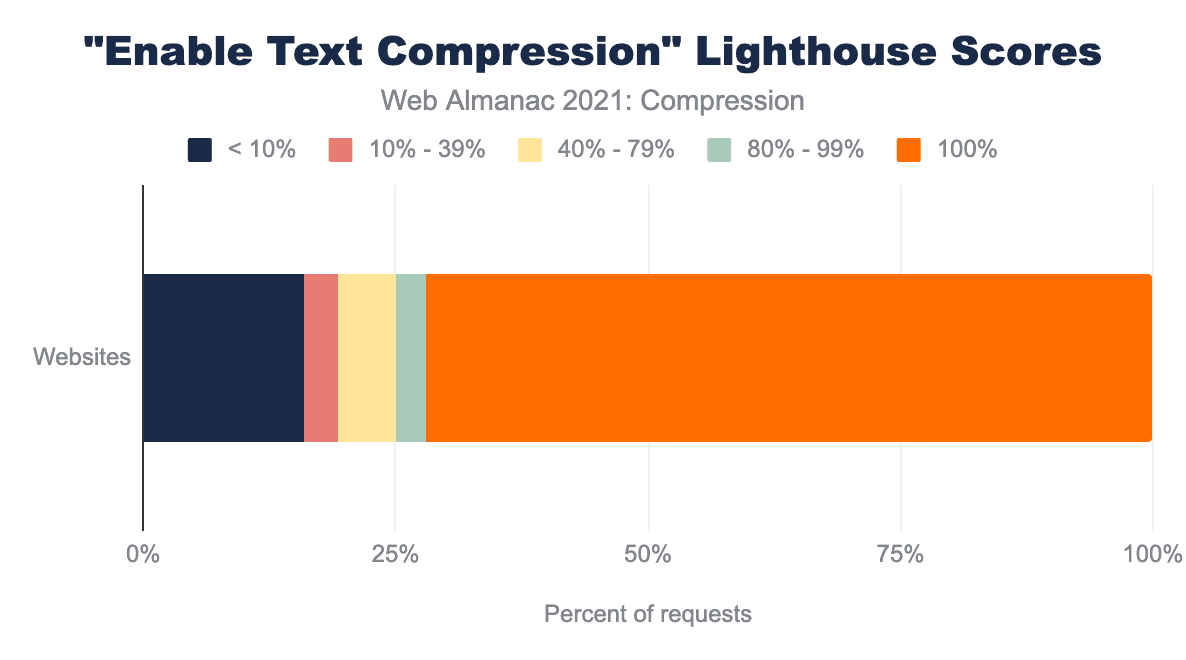The HTTP Archive runs Lighthouse audits for every mobile page, and from this data we observed that 72% of websites pass this audit. This is 2% less than last year’s 74%, which is despite more usage of text compression overall compared to last year, a slight drop.