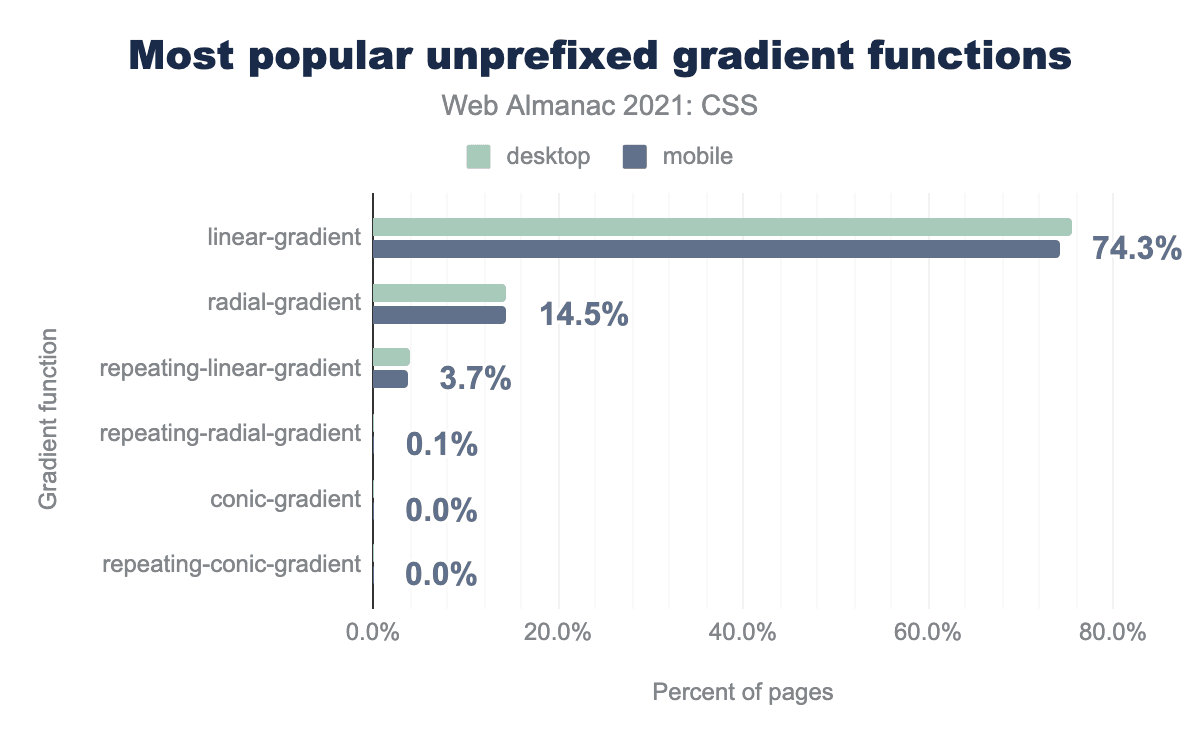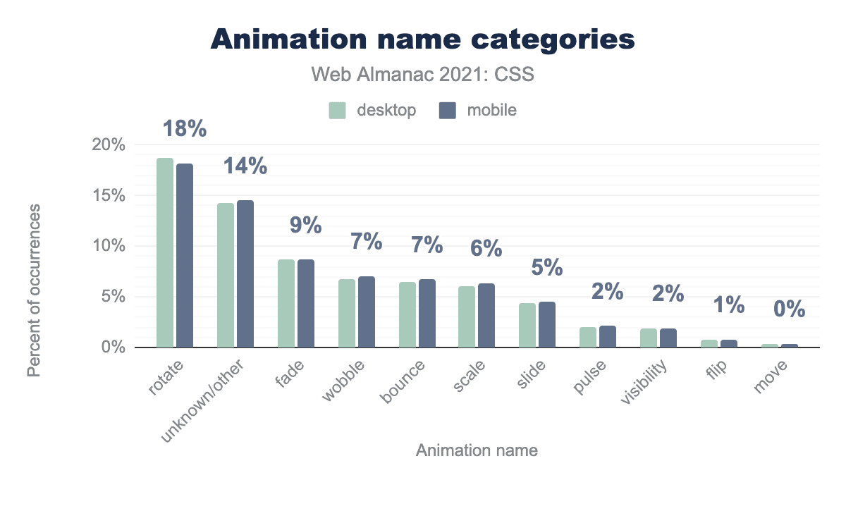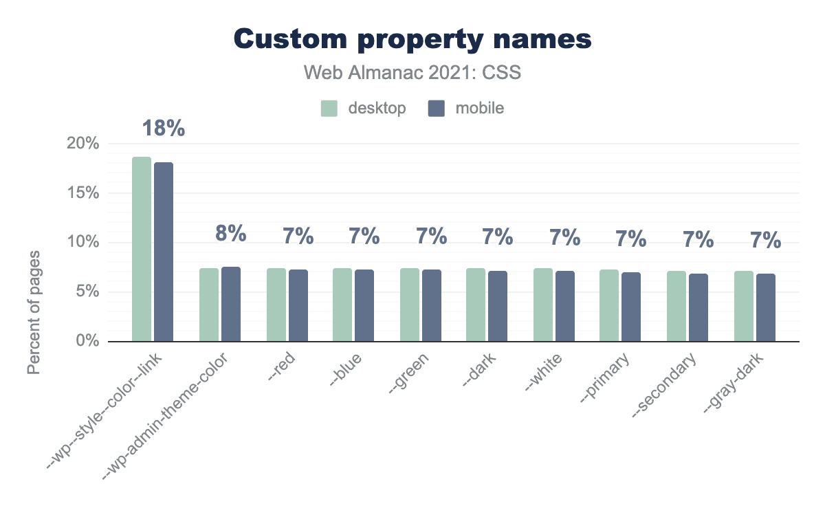 In some ways, CSS Houdini represents the opposite of the CSS-in-JS approach: it allows authors to mix a little JS into their CSS. Perhaps in part due to slow implementation (in browsers that aren’t based on Blink) of core parts of the specification, Houdini has struggled to find its feet. We find that it’s effectively not used on the open web in 2021: only 1,030 desktop pages and 1,175 mobile pages show evidence of animated custom properties, a feature of Houdini. This is a threefold increase over the 2020 findings, but it looks like it will still be some time before Houdini finds an audience.
