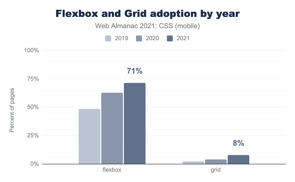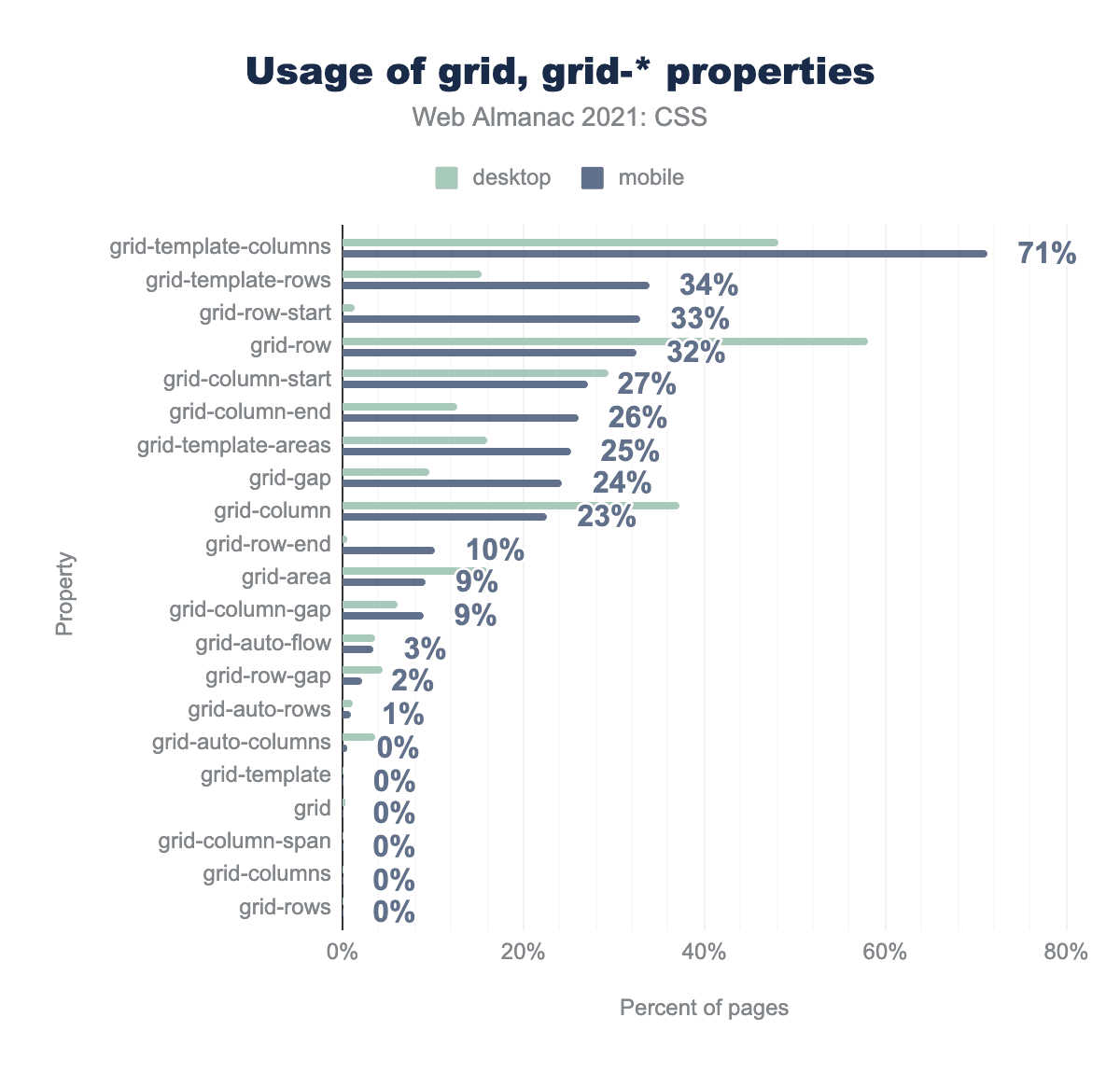 The pattern observed in past years is that Grid shorthand properties (grid-template, grid, etc.) are used far less often than the longhand properties they encompass. In fact, both come in at a staggering 0%, right next to each other in the rankings. The rest of the shorthands are all clustered with them, while longhand properties like grid-template-rows and grid-column enjoy widespread use. In fact, the only longhand property of any notable usage is grid-gap, with 24% usage on mobile Grid pages. It will be interesting to see if the more recent, and generic, gap will overtake grid-gap in years to come.