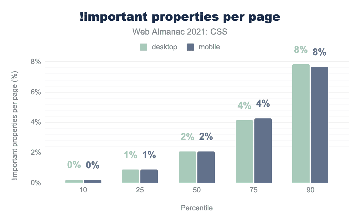 That old battleaxe !important maintains a toehold on the web, with its share of marked rules hardly changing at all compared to the 2020 Web Almanac.