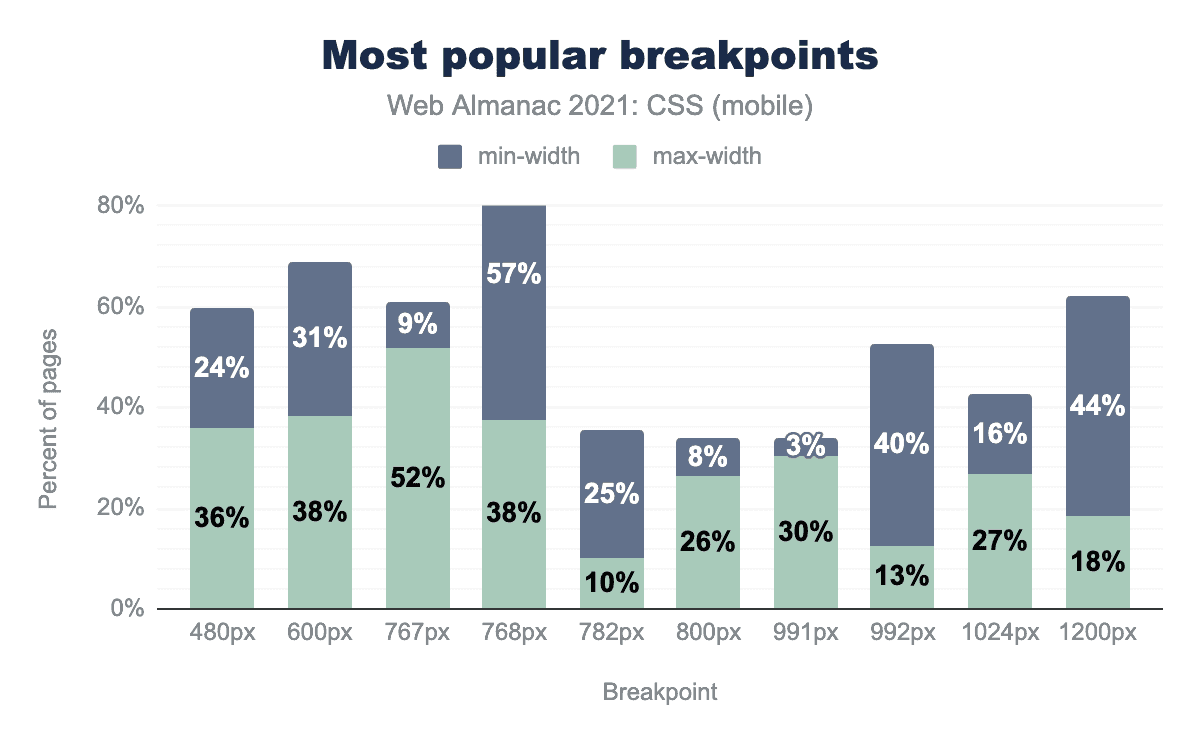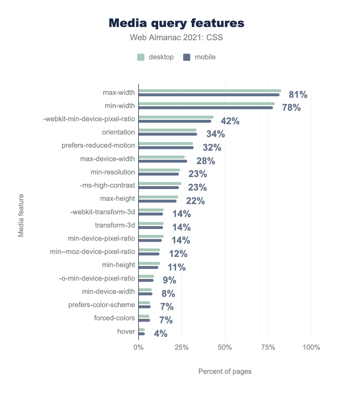 While CSS-in-JS adoption grew to 3% of all pages crawled (a 1 percentage point jump from last year), cutting-edge Houdini features are still mostly confined to tutorials and example galleries. Responsiveness continued to be one of most engrossing priorities, with max-width and min-width being the top media queries, and calc() being the top CSS function most commonly in use to determine widths.