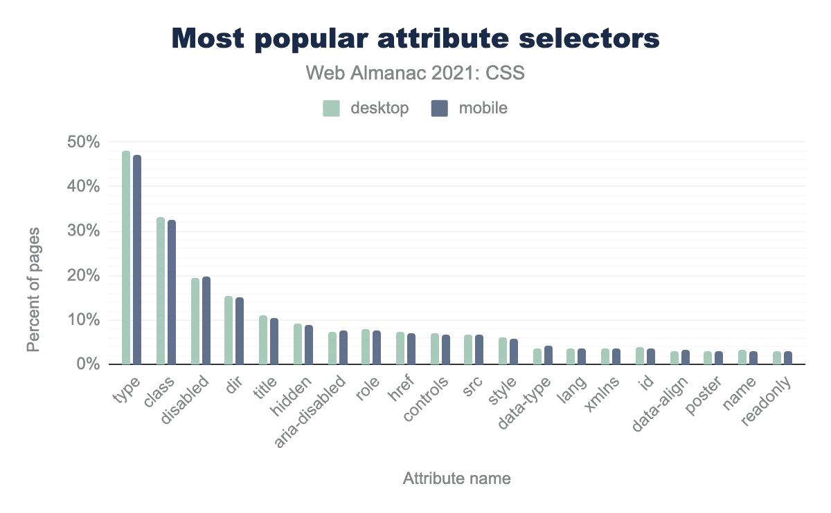 The most popular attribute selector continues to be type, which is most likely to be used in selecting form controls like checkboxes, radio buttons, text inputs, and so on.