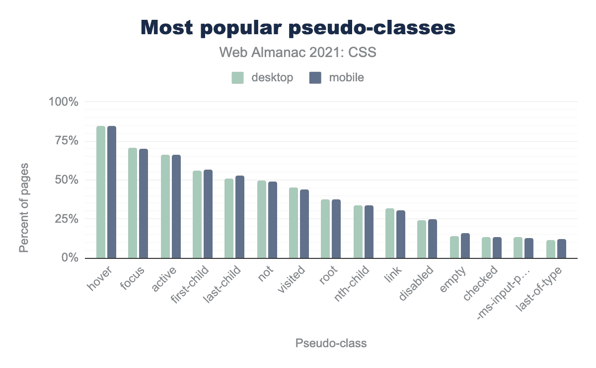 The ranking and distribution of both pseudo-classes and pseudo-elements was not greatly changed from the 2020 Web Almanac. A few rankings changed, but overall, things seemed highly static. Whether this represents a solidification of common practice, a snapshot of designer interests, or simply the nature of the analysis, is open to debate.