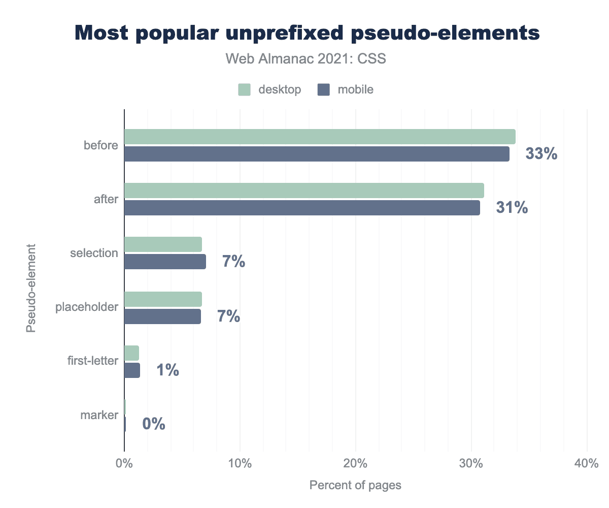 Most of the pseudo-elements in use are browser-specific ways of selecting things like specific interface components, parts of browser chrome, or highlighted text. Once we filtered those out, we found that ::first-letter is used on a very small number of pages, but still many more than ::first-line, which didn’t make it onto the chart at all. ::marker, a way of selecting list item markers like bullets or counters in an ordered list, has much less than 1% page share, yet still made it onto the list. We should note here that cross-browser support for ::marker is relatively new (October 2020). It will be interesting to see if use increases over the next few years.