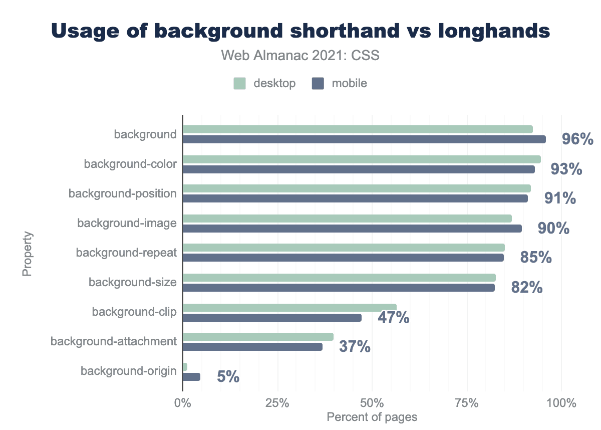 Since background longhand properties were at the top of the previous section’s chart, we turned our attention to the use of background shorthands and longhands.