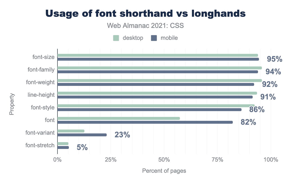 Just as was the case in 2020, the shorthand font came in behind all of its common longhand counterparts, with font-size leading the way and taking the top spot from last year’s winner, font-weight.