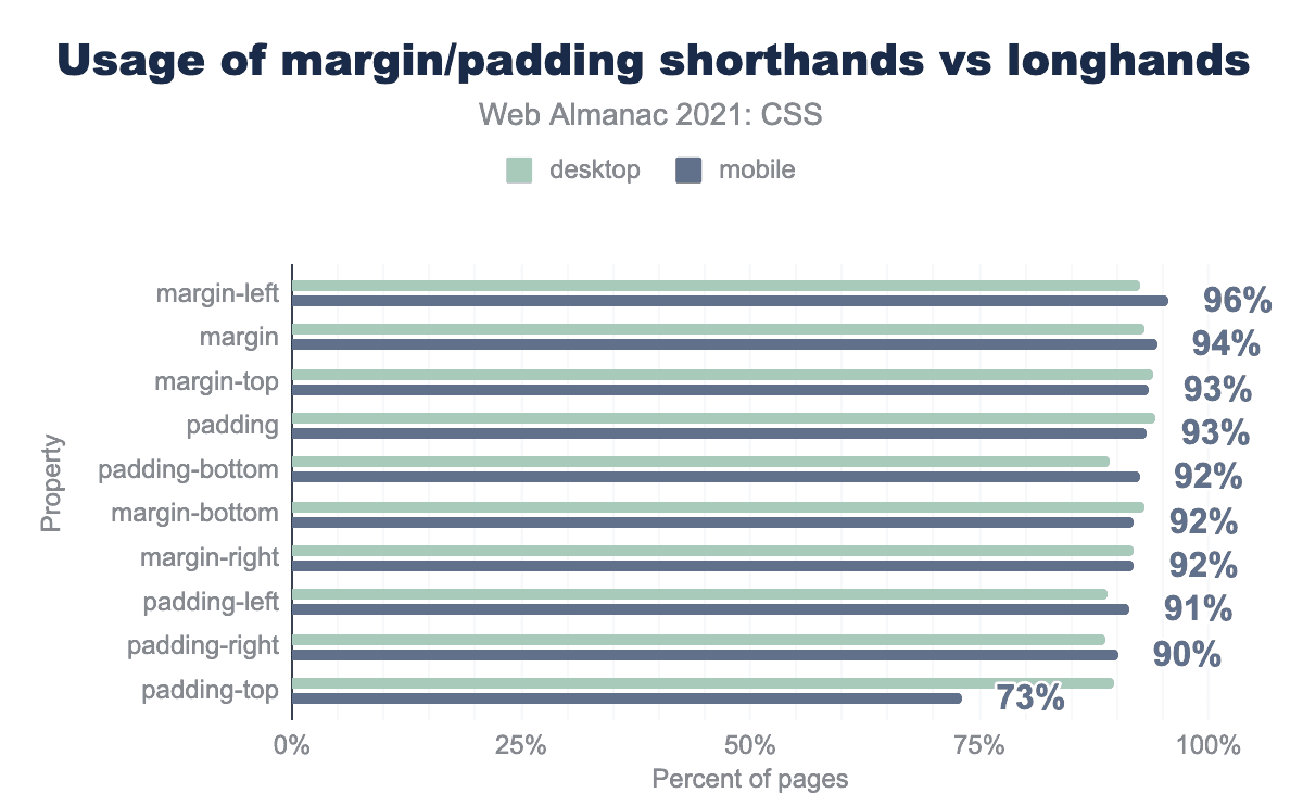 Moving down the list, we took a look at margin and padding properties. Much as with backgrounds, it’s more a surprise that any pages don’t set these properties than that so many do. What interested us this year was that the longhand margin-left edged out its shorthand counterpart margin to take the top ranking.