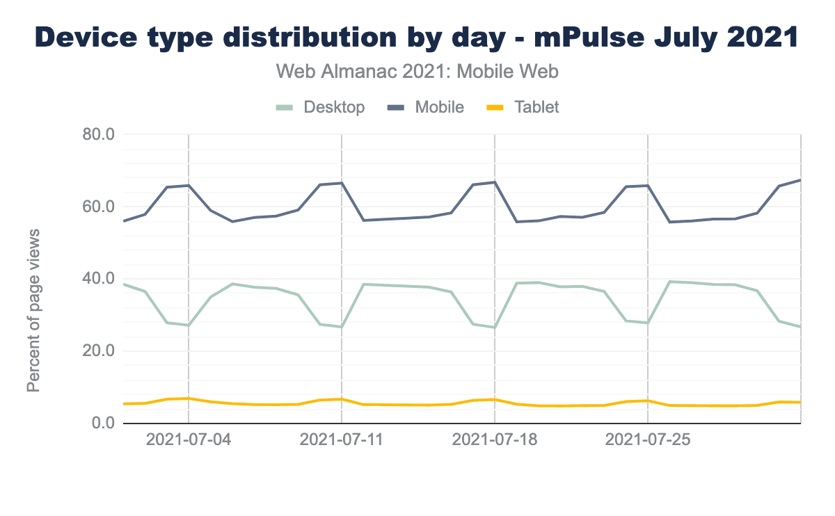 Fortunately, there are a few other sources. Paul Calvano ran some analysis on the Akamai mPulse real user monitoring data for July 2021. It found a slightly more even match between Mobile and Desktop traffic, at 59.4% being from mobile devices. The mPulse data is aggregated hourly, so it reveals some interesting trends