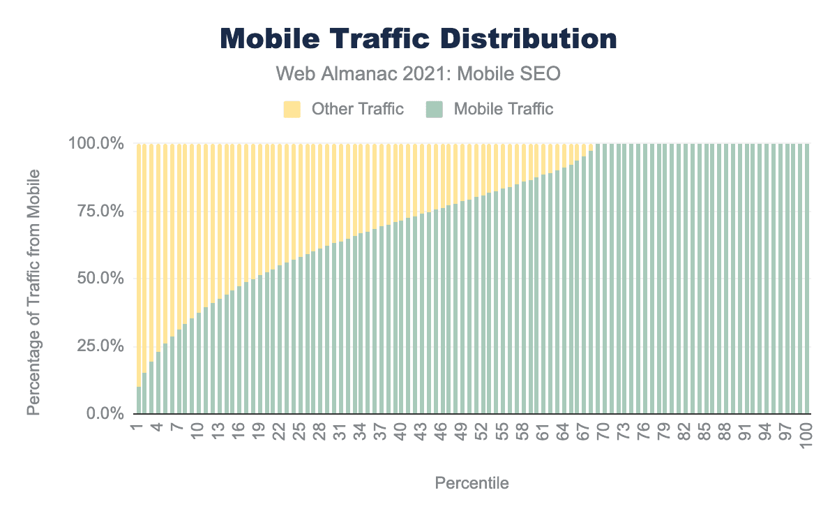 The distribution shows a similar, mobile heavy trend. At the 50th percentile, 79.4% of traffic comes from mobile devices, an increase over 77.6% in 2020, and catching up with the 79.9% percentage in 2019.