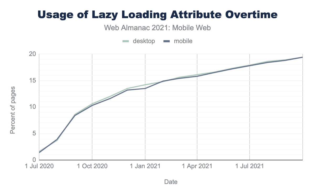 loading='lazy' attribute over time. The lines follow the upward trajectory, starting with 1.4% in July 2020 and climbing in tandem to 19.4% in October 2021.A driving factor in this growth can be attributed to the prevalence of WordPress (source: Rick Viscomi on Twitter). WordPress added support for native lazy-loading in version 5.5 which rolled out to the public on August 11th, 2020.