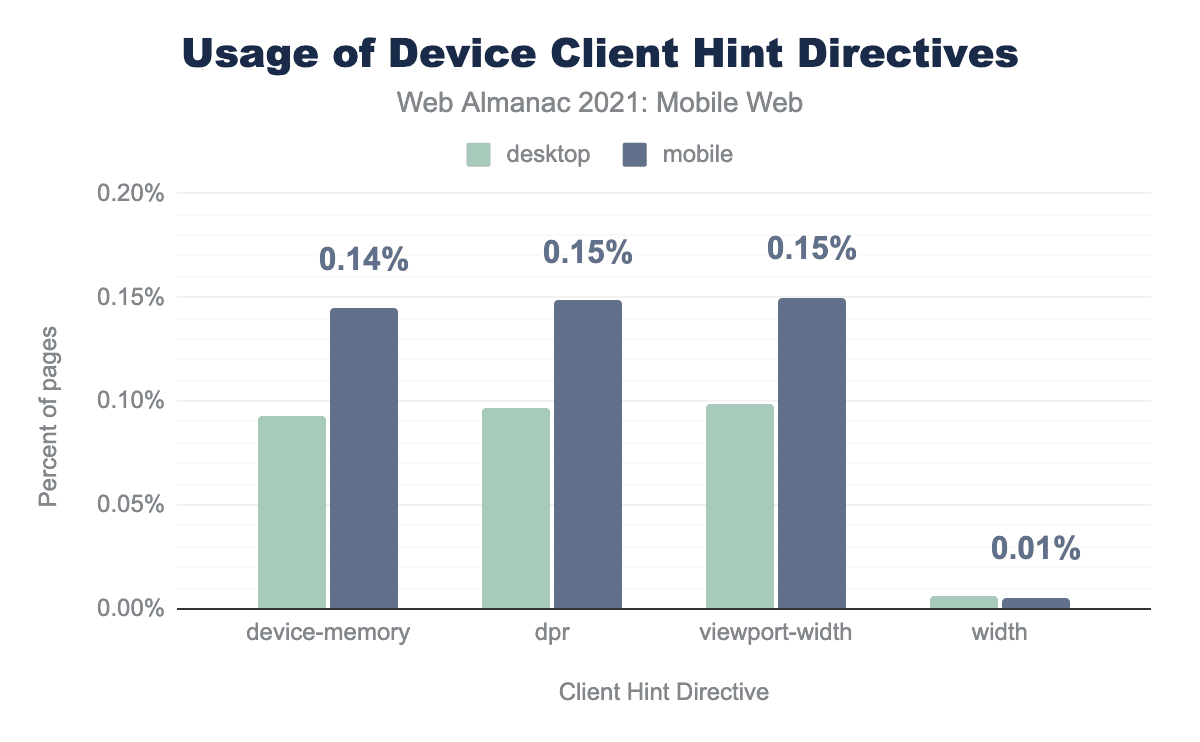 device-memory, dpr, or viewport-width Client Hints (approximately 0.10% compared to 0.15%). Usage of the width was equal between device types at 0.01%.