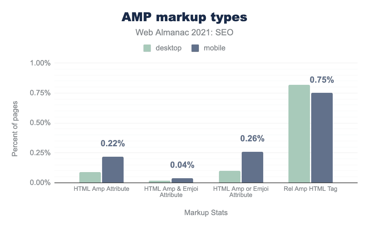 However, AMP adoption continued to increase in 2021. 0.09% of desktop pages now include the AMP attribute vs 0.22% for mobile pages. This is up from 0.06% on desktop pages and 0.15% on mobile pages in 2020.
