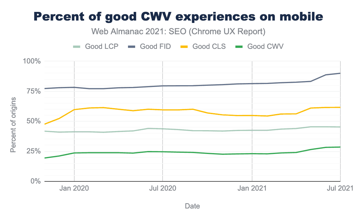 29% of mobile websites are now passing Core Web Vitals thresholds, up from 20% last year. Most websites are passing FID, but website owners seem to be struggling to improve CLS and LCP. See the Performance chapter for more on this topic.