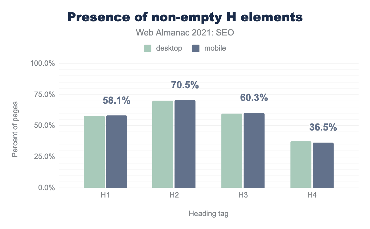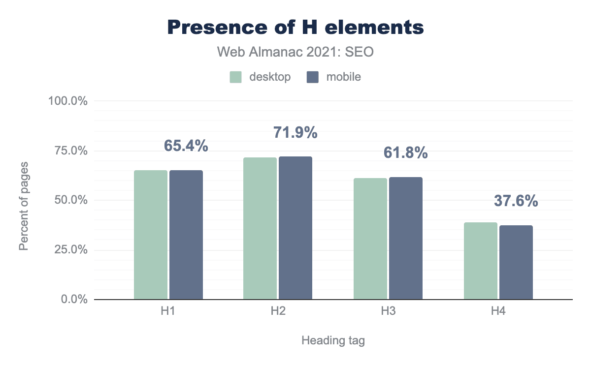 For main headings, more pages (71.9%) have h2s than have h1s (65.4%). There’s no obvious explanation for the discrepancy. 61.4% of desktop and mobile pages use h3s and less than 39% use h4s.