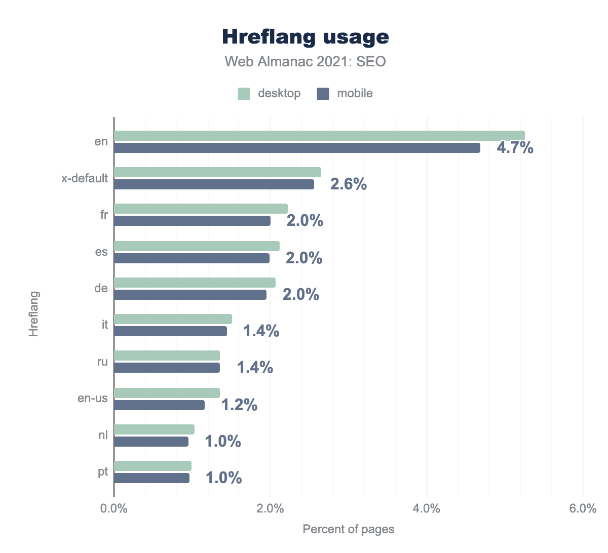 The most popular hreflang attribute is "en" (English version). 4.75% of mobile home pages use it and 5.32% of desktop home pages.
