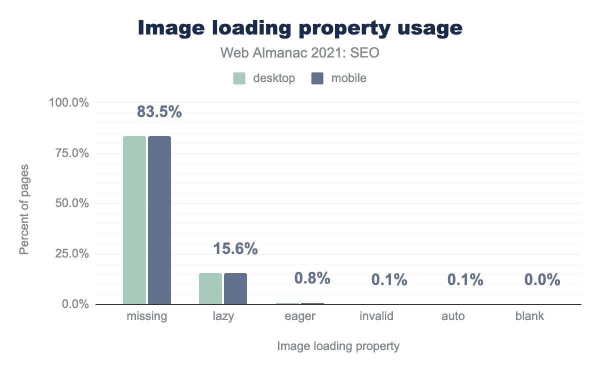 • 0.8% of pages use loading="eager" which loads the image as soon as the browser loads the code.