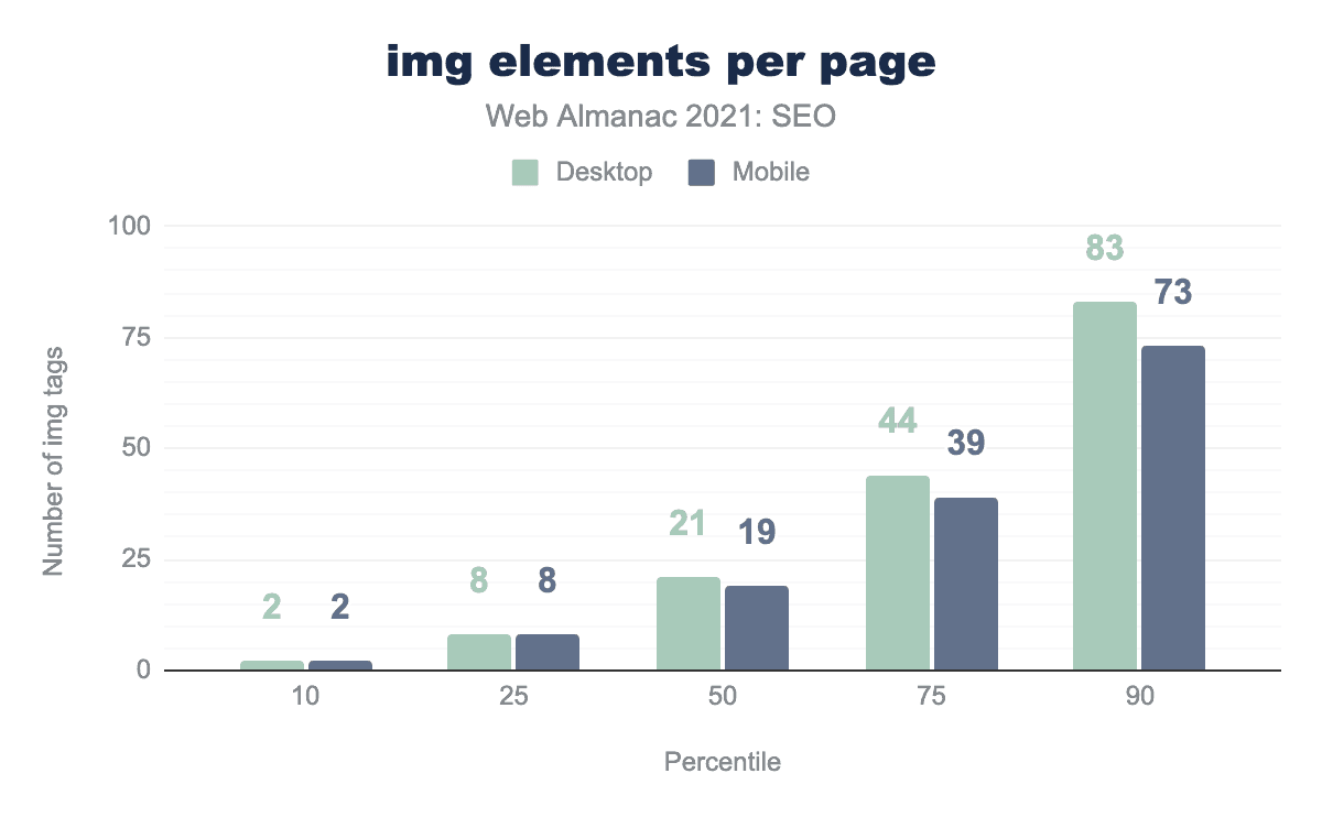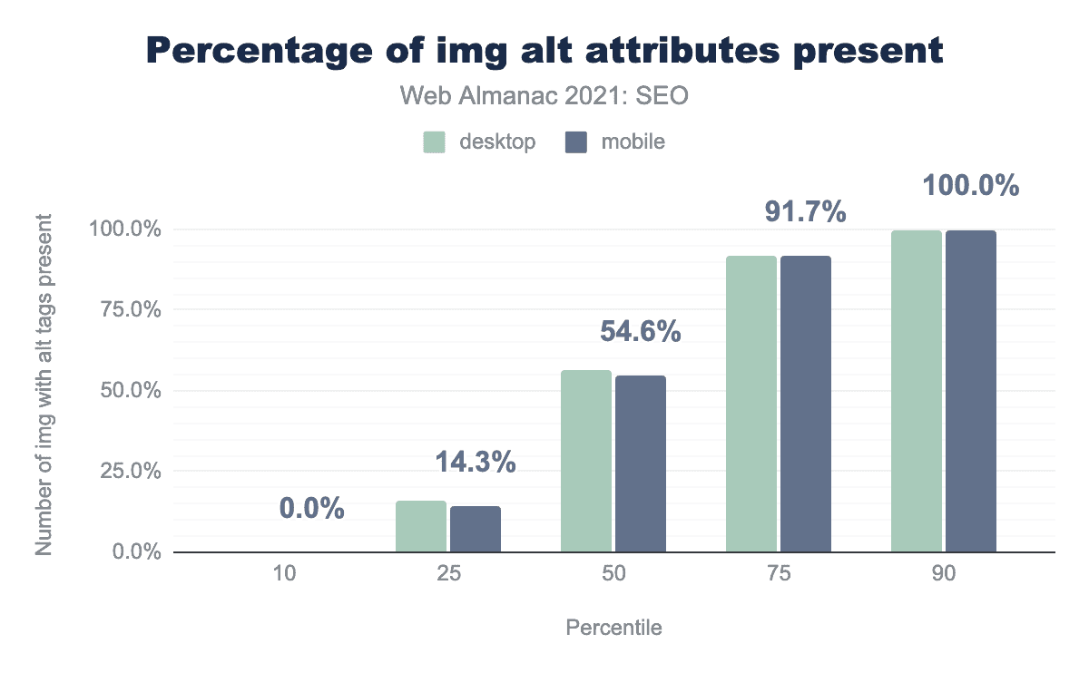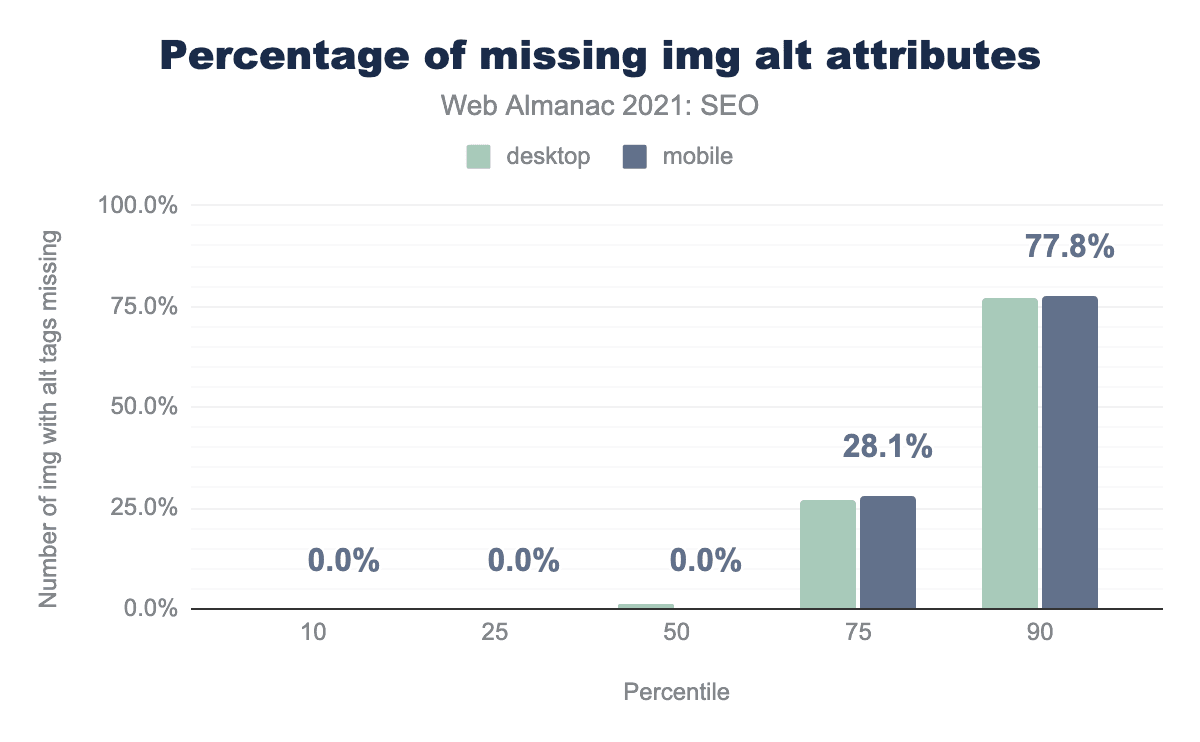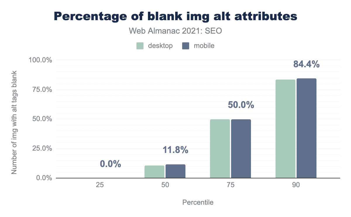 • However, on the median desktop and mobile pages 10.5% and 11.8% of <img> tags have blank alt attributes (respectively). This is effectively the same as 2020.