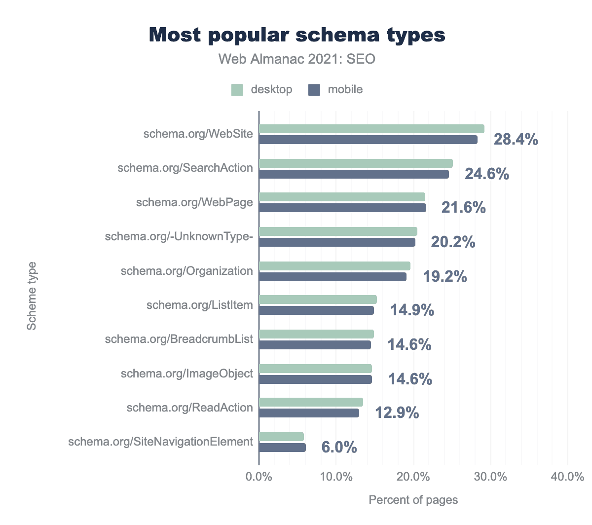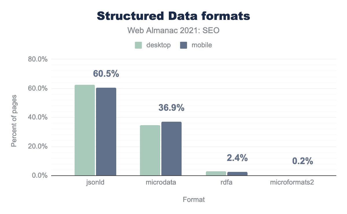 Structured data adoption is up a bit since last year. It’s used on 33.2% of pages in 2021 vs 30.6% in 2020.
