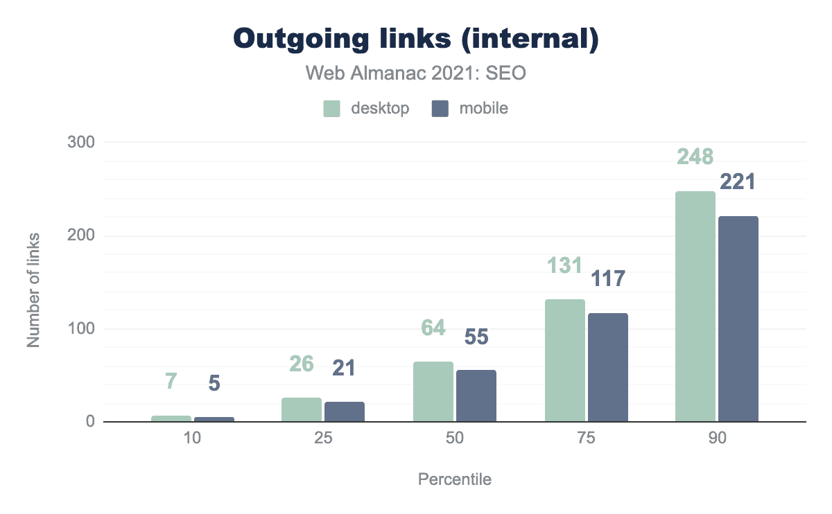 The data shows that the median number of internal links on desktop is 16% higher than mobile, 64 vs 55 respectively. It’s likely this is because developers tend to minimize the navigation menus and footers on mobile to make them easier to use on smaller screens.