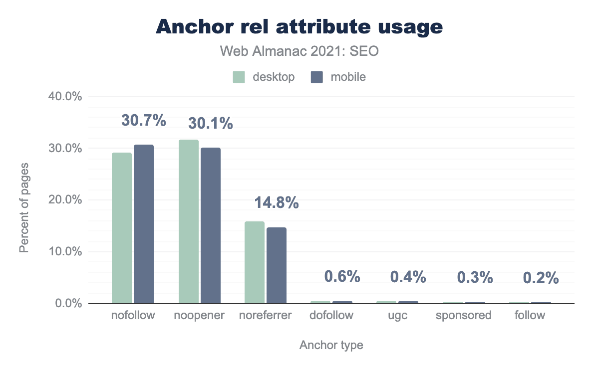 The new attributes are still fairly rare, at least on home pages, with rel="ugc" appearing on 0.4% of mobile pages and rel="sponsored" appearing on 0.3% of mobile pages. It’s likely these attributes are seeing more adoption on pages that aren’t home pages.