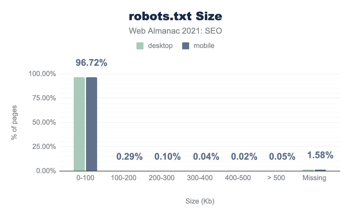 Most robots.txt files are fairly small, weighing between 0-100 kb. However, we did find over 3,000 domains that have a robots.txt file size over 500 KiB which is beyond Google’s max limit. Rules after this size limit will be ignored.