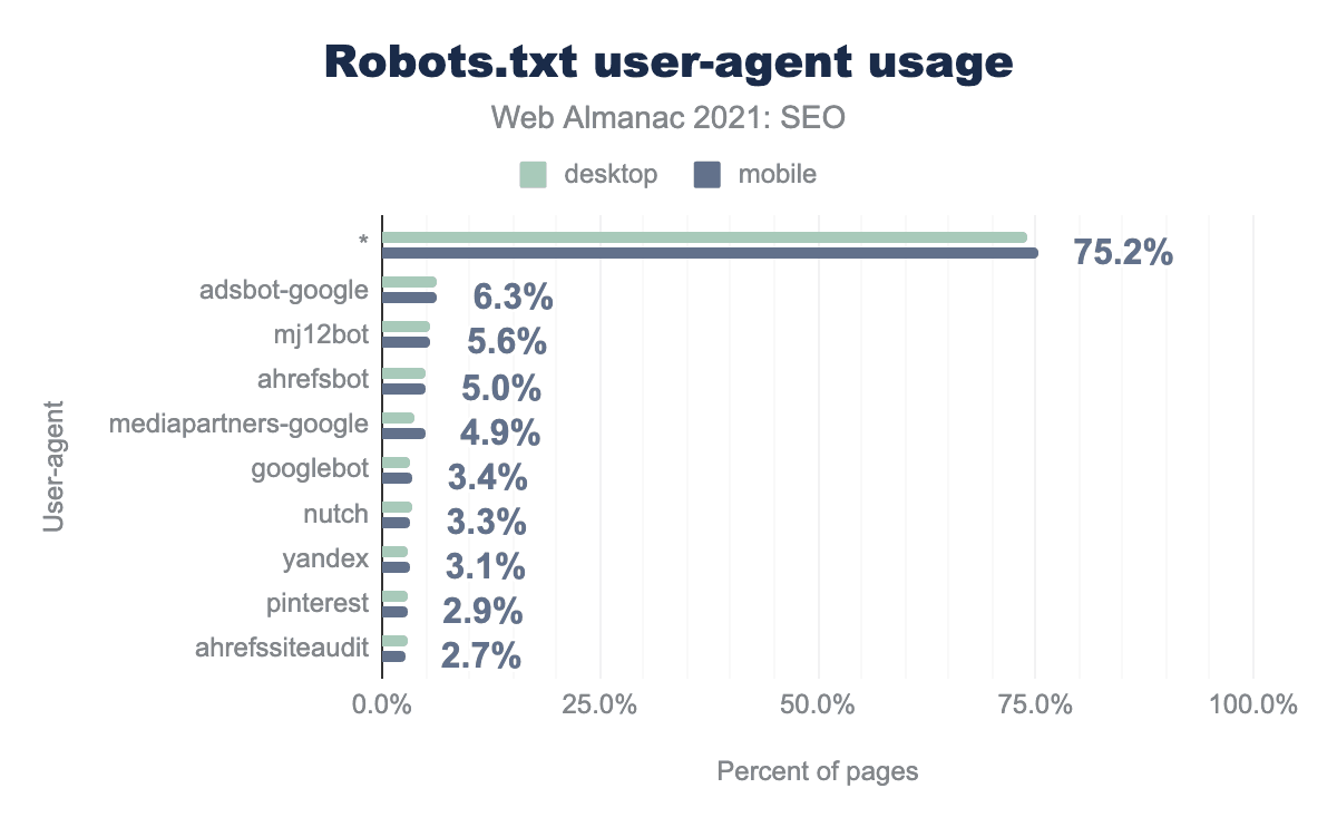 We saw two popular SEO-related robots: mj12bot (Majestic) and ahrefsbot (Ahrefs) in the top 5 most specified user agents.