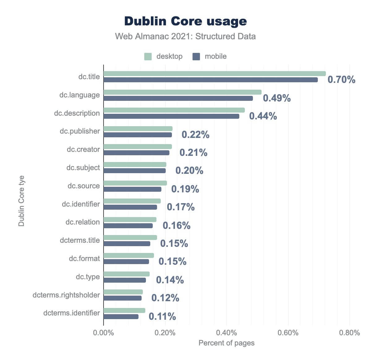 dc.title is on 0.70%, dc.language is on 0.49%, dc.description is on 0.44%, dc.publisher is on 0.22%, dc.creator is on 0.21%, dc.subject is on 0.20%, dc.source is on 0.19%, dc.identifier is on 0.17%, dc.relation is on 0.16%, dcterms.title is on 0.15%, dc.type is on 0.14%, dcterms.rightsholder is on 0.12%, and dcterms.identifier is on 0.11%. Desktop usage is similar.That the most popular attribute type is dc:title (on 0.70% of pages) comes as no surprise; but it is interesting to see that dc:language is next (above common descriptors like description, subject and publisher) with a penetration of 0.49%. This makes sense, when you consider that Dublin Core is often used in multilingual metadata management systems.